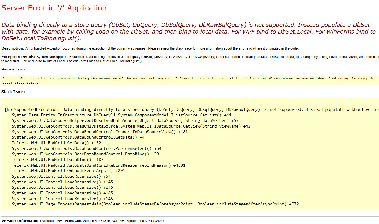 var result = from r in DbContext.Products select r;RadGrid1.DataSource = result.ToList();If I don't use add ToList() then I get the error. I am using version 2014.3.1209.45
