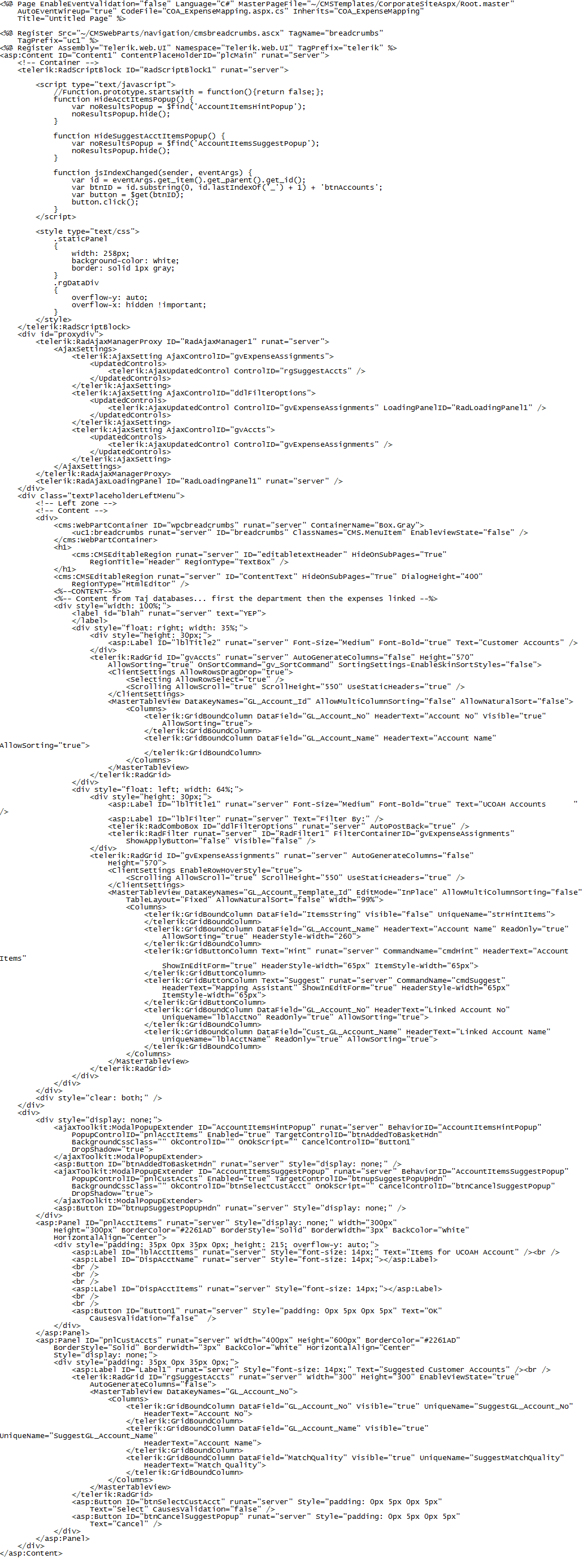The whole aspx file is attached as an image file. I get the same behavior wether I data bind the grid or not. The issue that I have found is that clientID in the javascript function is a function and not a string so it contains no method startsWith. I have found a workaround that creates an anonomous function for startsWith -