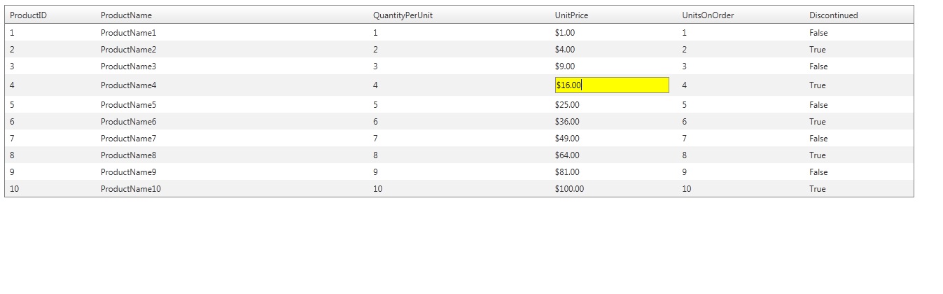 <ItemTemplate> <asp:Label ID="lblUnitPrice" runat="server" Text='<%# Eval("UnitPrice", "{0:C}") %>' /> <telerik:RadMaskedTextBox Mask="###" ID="txtUnitPrice" runat="server" Width="95%" Text='<%# Bind("UnitPrice") %>' Display="false"/> </ItemTemplate>function ShowColumnEditor() { editedCell = this; //hide text and show column editor in the edited cell var cellText = this.getElementsByTagName("span")[0]; cellText.style.display = "none"; //display the span which wrapps the hidden checkbox editor if (this.getElementsByTagName("span")[1]) { this.getElementsByTagName("span")[1].style.display = ""; } var colEditor = $telerik.findControl(editedCell,"txtUnitPrice") || this.getElementsByTagName("input")[0] || this.getElementsByTagName("select")[0]; if (colEditor instanceof Telerik.Web.UI.RadMaskedTextBox) { colEditor.set_visible(true); return; } //if the column editor is a form decorated select dropdown, show it instead of the original if (colEditor.className == "rfdRealInput" && colEditor.tagName.toLowerCase() == "select") colEditor = Telerik.Web.UI.RadFormDecorator.getDecoratedElement(colEditor); colEditor.style.display = ""; colEditor.focus(); }You can use validators in RadGrid as shown in this online demo. Kind regards,