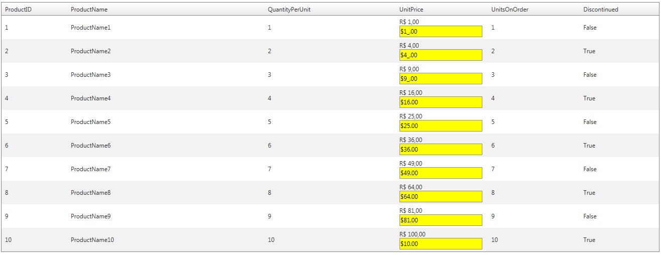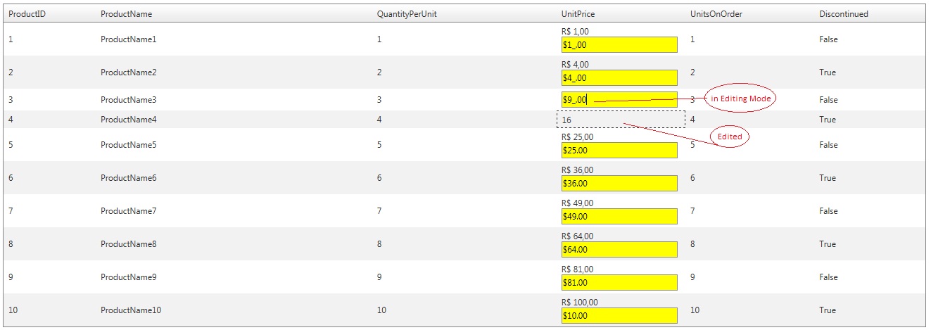<div id="divMaskedTextBox" style="display:none;"> <telerik:RadMaskedTextBox Mask="$##.00" BackColor="Yellow" ID="txtUnitPrice" runat="server" Width="95%" Text='<%# Bind("UnitPrice") %>' /> </div>Attached is the modified page.