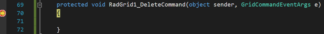 <telerik:RadGrid ID="RadGrid1" runat="server" OnDeleteCommand="RadGrid1_DeleteCommand"> <MasterTableView AutoGenerateColumns="False" DataKeyNames="OrderID"> <Columns> <%--Ommited for brevity--%>Place a debugger at the OnDeleteCommand event handler and press the button. The breakpoint is hit.