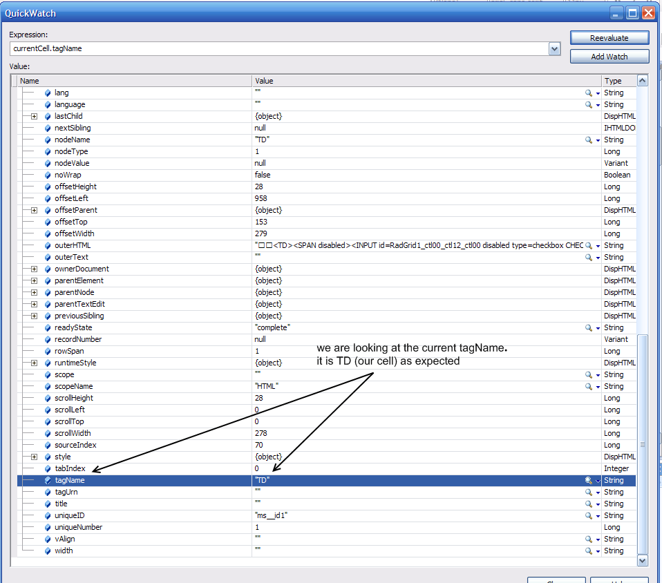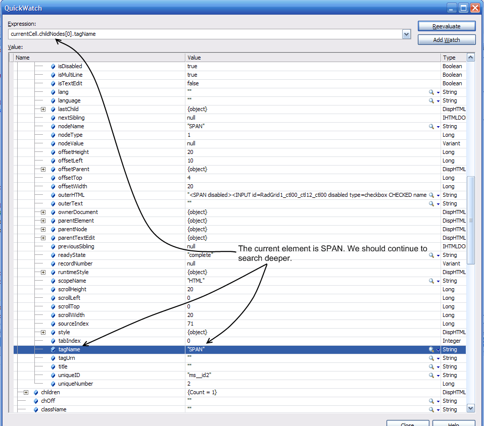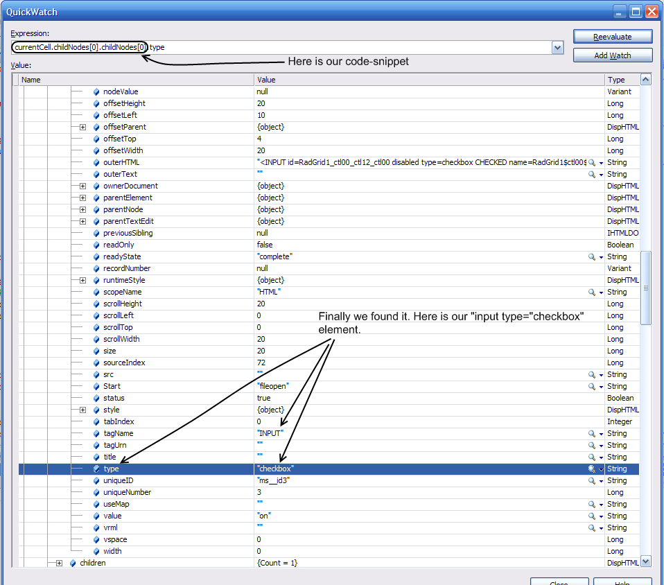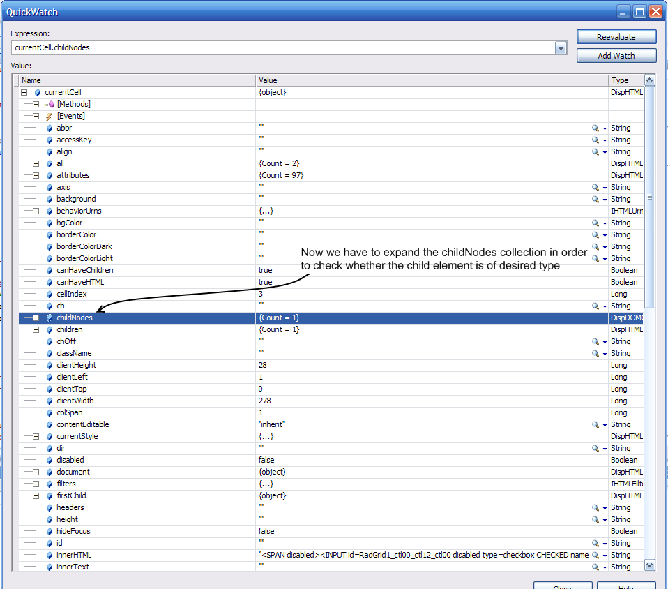 I'm trying to find information about a property that exists in the radGrid cells; the checkbox - "childNodes[1].checked".