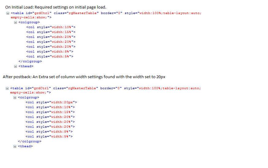<telerik:GridTemplateColumn HeaderText="One" SortExpression="One" DataField="One" UniqueName="One" ItemStyle-Width="10%" HeaderStyle-Width="10%"> <ItemTemplate> <%# DataBinder.Eval(Container.DataItem, "One").ToString%> </ItemTemplate></telerik:GridTemplateColumn> <telerik:GridTemplateColumn HeaderText="Two" SortExpression="Two" UniqueName="Two" DataField="Two" ItemStyle-Width="15%" HeaderStyle-Width="15%"> <ItemTemplate> <%# DataBinder.Eval(Container.DataItem, "Two").ToString().Split(" ")(0)%> </ItemTemplate></telerik:GridTemplateColumn> <telerik:GridTemplateColumn HeaderText="Three" SortExpression="Three" DataField="Three" UniqueName="Three" ItemStyle-Width="20%" HeaderStyle-Width="20%"> <ItemTemplate> <%# DataBinder.Eval(Container.DataItem, "Three").ToString%> </ItemTemplate></telerik:GridTemplateColumn><telerik:GridTemplateColumn HeaderText="Four" SortExpression="Four" DataField="Four" UniqueName="Four" ItemStyle-Width="20%" HeaderStyle-Width="20%"> <ItemTemplate> <%# DataBinder.Eval(Container.DataItem, "Four").ToString.Replace(Chr(13),"</br>")%> </ItemTemplate></telerik:GridTemplateColumn><telerik:GridTemplateColumn HeaderText="Five" SortExpression="Five" UniqueName="Five" DataField="Five" ItemStyle-Width="20%" HeaderStyle-Width="20%"> <ItemTemplate> <%# DataBinder.Eval(Container.DataItem, "Five").ToString%> </ItemTemplate></telerik:GridTemplateColumn><telerik:GridTemplateColumn HeaderText="Six" SortExpression="Six" UniqueName="Six" DataField="Six" ItemStyle-Width="8%" HeaderStyle-Width="8%"> <ItemTemplate> <%# DataBinder.Eval(Container.DataItem, "Six").ToString().Split(" ")(0)%> </ItemTemplate></telerik:GridTemplateColumn>Column settings for the colGroup changes during a postback. I found an extra set of col width setting inserted after postback which has the width set in pixels. Where as the width settings for the tbody contents are fine. I have attached an image showing the width settings rendered before and after postback below.