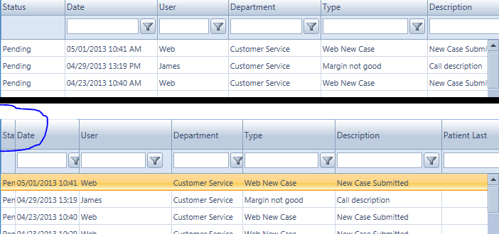 <telerik:RadGrid ID="gridCustomers" EnableLinqExpressions="false" Width="100%" Height="350" OnNeedDataSource="gridCustomers_NeedDataSource" onitemcommand="gridCustomers_ItemCommand" OnInit="gridCustomers_Init" runat="server" AllowPaging="true" AllowCustomPaging="true" PageSize="10" EnableAjaxSkinRendering="true" GridLines="None" AllowSorting="true" style="border:none !important;"> <PagerStyle Mode="NextPrevAndNumeric" AlwaysVisible="true" /> <ClientSettings EnablePostBackOnRowClick="true" EnableRowHoverStyle="true" AllowColumnsReorder="false" Resizing-AllowColumnResize="false"> <Scrolling SaveScrollPosition="true" AllowScroll="true" UseStaticHeaders="true" /> <Selecting AllowRowSelect="True" /> </ClientSettings> <HeaderStyle Wrap="false" /> <ItemStyle Wrap="false" Font-Size="11px" CssClass="gridCursor" /> <AlternatingItemStyle Wrap="false" Font-Size="11px" CssClass="gridCursor" /> <GroupingSettings CaseSensitive="false" /> <MasterTableView DataKeyNames="CustomerID" GroupLoadMode="Server" NoMasterRecordsText="No Customers available for display..." TableLayout="Auto" AutoGenerateColumns="false" AllowFilteringByColumn="true"> <FilterItemStyle HorizontalAlign="Left" /> <HeaderStyle HorizontalAlign="Left" /> <Columns> <telerik:GridBoundColumn DataField="CustomerID" UniqueName="CustomerID" SortExpression="CustomerID" HeaderStyle-Width="140px" HeaderText="Customer ID" CurrentFilterFunction="Contains" FilterControlWidth="100px" ItemStyle-HorizontalAlign="Left" AutoPostBackOnFilter="true"></telerik:GridBoundColumn> <telerik:GridBoundColumn DataField="AccountNumber" HeaderStyle-Width="120px" HeaderText="Account" CurrentFilterFunction="Contains" FilterControlWidth="80px" ItemStyle-HorizontalAlign="Left" AutoPostBackOnFilter="true"></telerik:GridBoundColumn> <telerik:GridBoundColumn DataField="FirstName" HeaderStyle-Width="120px" HeaderText="First Name" ItemStyle-HorizontalAlign="Left" CurrentFilterFunction="Contains" FilterControlWidth="80px" AutoPostBackOnFilter="true"></telerik:GridBoundColumn> <telerik:GridBoundColumn DataField="LastName" HeaderStyle-Width="120px" HeaderText="Last Name" ItemStyle-HorizontalAlign="Left" CurrentFilterFunction="Contains" FilterControlWidth="80px" AutoPostBackOnFilter="true"></telerik:GridBoundColumn> <telerik:GridBoundColumn DataField="OfficePhone" HeaderStyle-Width="110px" HeaderText="Office Phone" ItemStyle-HorizontalAlign="Left" CurrentFilterFunction="Contains" FilterControlWidth="60px" AutoPostBackOnFilter="true"></telerik:GridBoundColumn> <telerik:GridBoundColumn DataField="PracticeName" HeaderStyle-Width="170px" HeaderText="Practice Name" ItemStyle-HorizontalAlign="Left" HtmlEncode="true" HeaderStyle-HorizontalAlign="Left" CurrentFilterFunction="Contains" FilterControlWidth="130px" AutoPostBackOnFilter="true"></telerik:GridBoundColumn> <telerik:GridBoundColumn DataField="Cell" HeaderStyle-Width="100px" HeaderText="Cell Phone" ItemStyle-HorizontalAlign="Left" CurrentFilterFunction="Contains" FilterControlWidth="60px" AutoPostBackOnFilter="true"></telerik:GridBoundColumn> <telerik:GridBoundColumn DataField="Address1" HeaderStyle-Width="160px" HeaderText="Address 1" ItemStyle-HorizontalAlign="Left" CurrentFilterFunction="Contains" FilterControlWidth="120px" AutoPostBackOnFilter="true"></telerik:GridBoundColumn> <telerik:GridBoundColumn DataField="City" HeaderStyle-Width="100px" HeaderText="City" ItemStyle-HorizontalAlign="Left" CurrentFilterFunction="Contains" FilterControlWidth="60px" AutoPostBackOnFilter="true"></telerik:GridBoundColumn> <telerik:GridBoundColumn DataField="State" HeaderStyle-Width="70px" HeaderText="State" ItemStyle-HorizontalAlign="Left" CurrentFilterFunction="Contains" FilterControlWidth="30px" AutoPostBackOnFilter="true"></telerik:GridBoundColumn> <telerik:GridBoundColumn DataField="ZipCode" HeaderStyle-Width="90px" HeaderText="Zip Code" ItemStyle-HorizontalAlign="Left" CurrentFilterFunction="Contains" FilterControlWidth="50px" AutoPostBackOnFilter="true"></telerik:GridBoundColumn> <telerik:GridBoundColumn DataField="Country" HeaderStyle-Width="90px" HeaderText="Country" ItemStyle-HorizontalAlign="Left" CurrentFilterFunction="Contains" FilterControlWidth="50px" AutoPostBackOnFilter="true"></telerik:GridBoundColumn> <telerik:GridBoundColumn DataField="Email" HeaderStyle-Width="230px" HeaderText="Email" ItemStyle-HorizontalAlign="Left" CurrentFilterFunction="Contains" FilterControlWidth="190px" AutoPostBackOnFilter="true"></telerik:GridBoundColumn> </Columns> </MasterTableView> </telerik:RadGrid>0