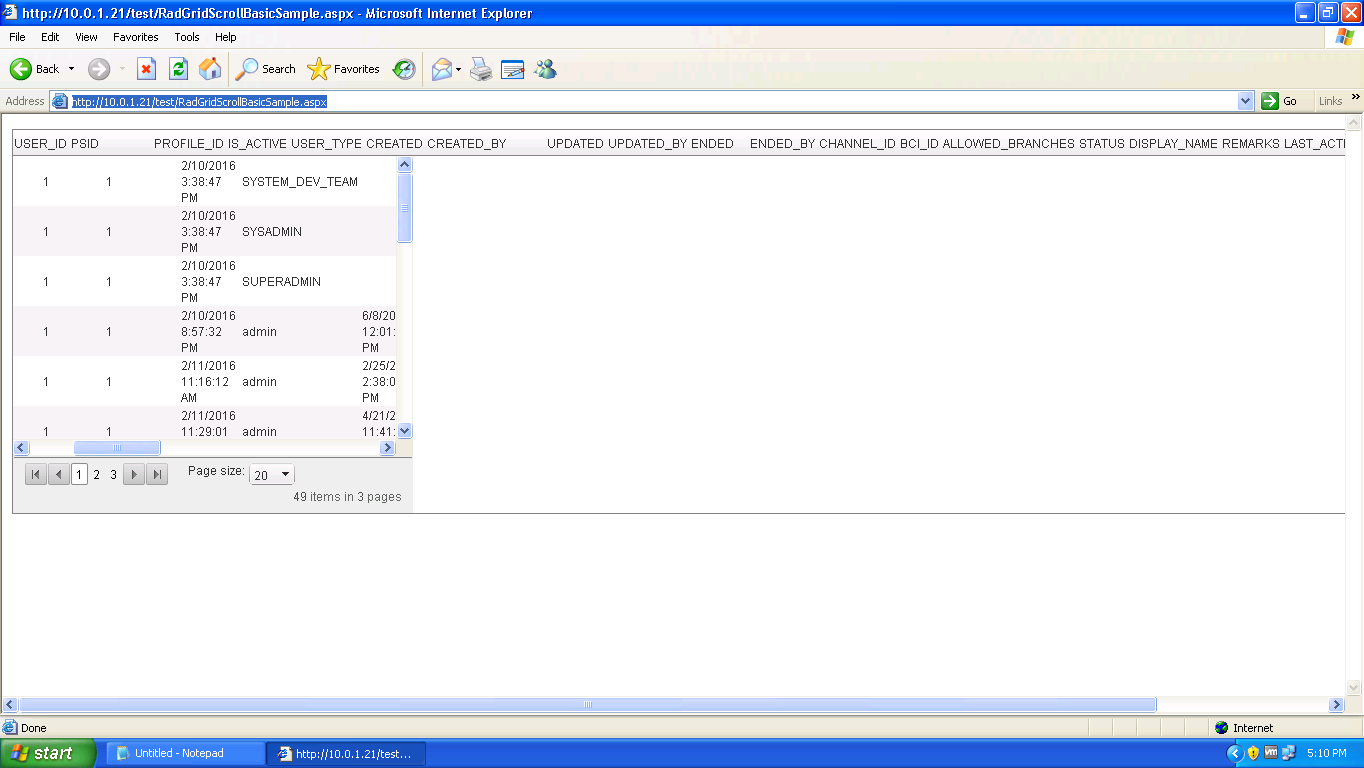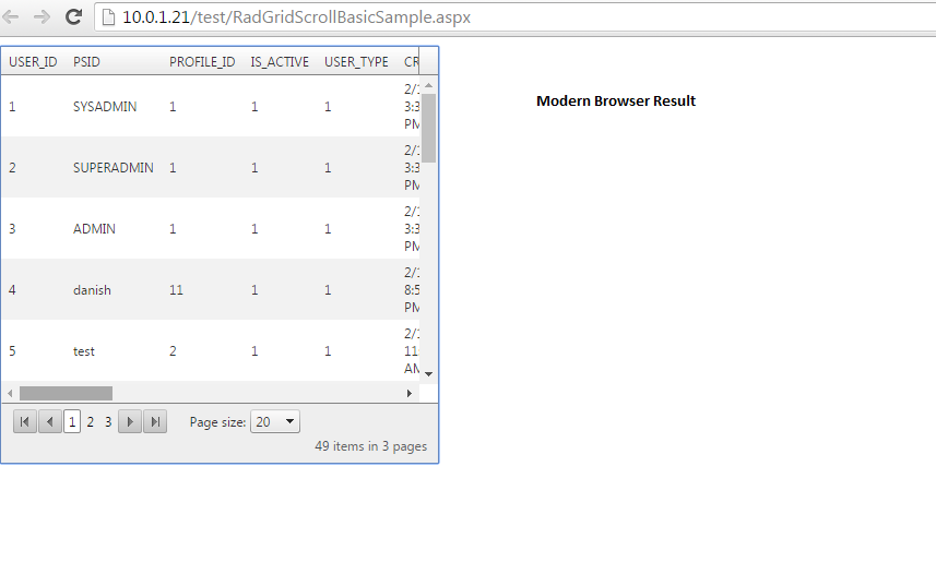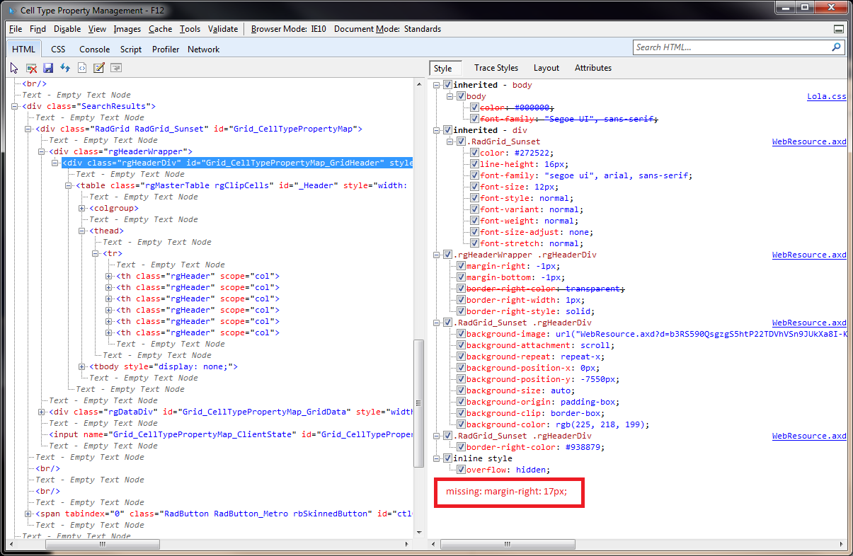 the code behind will be something when the button click, then the grid will be populated. did not see anything to do from code behind. I attached the screenshots here, one for page, one the F12 tool in IE10. so hope something from setting to control the control's render for the scroll and static header alignments by the style injection dynamically. because I played around bit with add on that missing inline style, and found another issue if I change the div rgDataDiv inline style height to 100% to make the scroll bar disappear, then the alignments will be happening in the expected way -- the space I attached in the header becomes the killer again. hope this maybe not really true for the play from the tool for this feature. please advice and thanks lots.