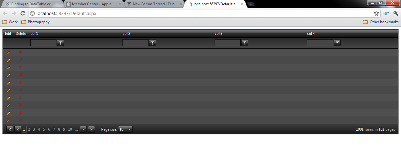 Protected Sub Page_Load(sender As Object, e As EventArgs) If Not IsPostBack Then btncol.ButtonType = GridButtonColumnType.PushButton btncol.HeaderText = "Edit" btncol.UniqueName = "Edit" btncol.CommandName = "Edit" Me.uxGrid.MasterTableView.Columns.Add(btncol) ' similarly add the Delete Button Me.uxGrid.DataSource = dt Dim dc As DataColumn For Each dc_loopVariable As Object In dt.Columns dc = dc_loopVariable GC = New GridBoundColumn() GC.HeaderText = dc.Caption GC.UniqueName = dc.Caption GC.DataField = dc.Caption Me.uxGrid.MasterTableView.Columns.Add(GC) Next Me.uxGrid.DataBind() End IfEnd SubThanks,