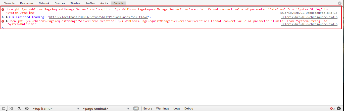 <telerik:RadGrid ID="RadGrid1" runat="server" CellSpacing="0" DataSourceID="obsShiftPeriods" GridLines="None" Skin="Metro" AllowAutomaticDeletes="True" AllowAutomaticInserts="True" AllowAutomaticUpdates="True"> <MasterTableView CommandItemDisplay="Top" AutoGenerateColumns="False" DataSourceID="obsShiftPeriods" DataKeyNames="ShiftId,PeriodId"> <CommandItemSettings ExportToPdfText="Export to PDF" /> <RowIndicatorColumn FilterControlAltText="Filter RowIndicator column" Visible="True"> <HeaderStyle Width="20px" /> </RowIndicatorColumn> <ExpandCollapseColumn FilterControlAltText="Filter ExpandColumn column" Visible="True"> <HeaderStyle Width="20px" /> </ExpandCollapseColumn> <Columns> <telerik:GridEditCommandColumn ButtonType="ImageButton" HeaderStyle-Width="3%"> <HeaderStyle Width="3%" /> </telerik:GridEditCommandColumn> <telerik:GridButtonColumn CommandName="Delete" Text="Delete" UniqueName="DeleteColumn" ButtonType="ImageButton" ImageUrl="~/images/delete.png" ConfirmText="Are you sure?"> </telerik:GridButtonColumn> <telerik:GridDateTimeColumn DataField="DateFrom" DataFormatString="{0:dd/MM/yyyy}" DataType="System.DateTime" FilterControlAltText="Filter DateFrom column" HeaderText="Date From" UniqueName="DateFrom"> </telerik:GridDateTimeColumn> <telerik:GridDateTimeColumn DataField="DateTo" DataFormatString="{0:dd/MM/yyyy}" DataType="System.DateTime" FilterControlAltText="Filter DateTo column" HeaderText="Date To" UniqueName="DateTo"> </telerik:GridDateTimeColumn> <telerik:GridDateTimeColumn DataField="TimeIn" DataType="System.DateTime" DataFormatString="{0:hh:mm tt}" FilterControlAltText="Filter TimeIn column" HeaderText="Time In" PickerType="TimePicker" UniqueName="TimeIn"> </telerik:GridDateTimeColumn> <telerik:GridBoundColumn DataField="GraceIn" DataType="System.Int32" FilterControlAltText="Filter GraceIn column" HeaderText="GraceIn" SortExpression="GraceIn" UniqueName="GraceIn"> </telerik:GridBoundColumn> <telerik:GridDateTimeColumn DataField="TimeOut" DataType="System.DateTime" DataFormatString="{0:hh:mm tt}" FilterControlAltText="Filter TimeOut column" HeaderText="Time Out" PickerType="TimePicker" UniqueName="TimeOut"> </telerik:GridDateTimeColumn> <telerik:GridBoundColumn DataField="GraceOut" DataType="System.Int32" FilterControlAltText="Filter GraceOut column" HeaderText="GraceOut" SortExpression="GraceOut" UniqueName="GraceOut"> </telerik:GridBoundColumn> <telerik:GridBoundColumn DataField="OverTimeStart" DataType="System.Int32" FilterControlAltText="Filter OverTimeStart column" HeaderText="OverTimeStart" SortExpression="OverTimeStart" UniqueName="OverTimeStart"> </telerik:GridBoundColumn> <telerik:GridBoundColumn DataField="AbsertAfter" DataType="System.Int32" FilterControlAltText="Filter AbsertAfter column" HeaderText="AbsertAfter" SortExpression="AbsertAfter" UniqueName="AbsertAfter"> </telerik:GridBoundColumn> <telerik:GridCheckBoxColumn DataField="Night" DataType="System.Boolean" FilterControlAltText="Filter Night column" HeaderText="Night" SortExpression="Night" UniqueName="Night"> </telerik:GridCheckBoxColumn> <telerik:GridCheckBoxColumn DataField="Sat" DataType="System.Boolean" FilterControlAltText="Filter Sat column" HeaderText="Sat" SortExpression="Sat" UniqueName="Sat"> </telerik:GridCheckBoxColumn> <telerik:GridCheckBoxColumn DataField="Sun" DataType="System.Boolean" FilterControlAltText="Filter Sun column" HeaderText="Sun" SortExpression="Sun" UniqueName="Sun"> </telerik:GridCheckBoxColumn> <telerik:GridCheckBoxColumn DataField="Mon" DataType="System.Boolean" FilterControlAltText="Filter Mon column" HeaderText="Mon" SortExpression="Mon" UniqueName="Mon"> </telerik:GridCheckBoxColumn> <telerik:GridCheckBoxColumn DataField="Tue" DataType="System.Boolean" FilterControlAltText="Filter Tue column" HeaderText="Tue" SortExpression="Tue" UniqueName="Tue"> </telerik:GridCheckBoxColumn> <telerik:GridCheckBoxColumn DataField="Wed" DataType="System.Boolean" FilterControlAltText="Filter Wed column" HeaderText="Wed" SortExpression="Wed" UniqueName="Wed"> </telerik:GridCheckBoxColumn> <telerik:GridCheckBoxColumn DataField="Thu" DataType="System.Boolean" FilterControlAltText="Filter Thu column" HeaderText="Thu" SortExpression="Thu" UniqueName="Thu"> </telerik:GridCheckBoxColumn> <telerik:GridCheckBoxColumn DataField="Fri" DataType="System.Boolean" FilterControlAltText="Filter Fri column" HeaderText="Fri" SortExpression="Fri" UniqueName="Fri"> </telerik:GridCheckBoxColumn> </Columns> <EditFormSettings> <EditColumn FilterControlAltText="Filter EditCommandColumn column"> </EditColumn> </EditFormSettings> </MasterTableView> <FilterMenu EnableImageSprites="False"> </FilterMenu></telerik:RadGrid>I logged error in Google Chrome