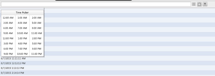 protected void RadGrid1_ItemCreated(object sender, GridItemEventArgs e){ if (e.Item is GridFilteringItem) { GridFilteringItem filteringItem = e.Item as GridFilteringItem; RadDateTimePicker picker = filteringItem["Date"].Controls[0] as RadDateTimePicker; picker.SharedTimeView.TimeFormat = "HH:mm:ss"; picker.SharedTimeView.Interval = new TimeSpan(0, 45, 0); }}Regards,
