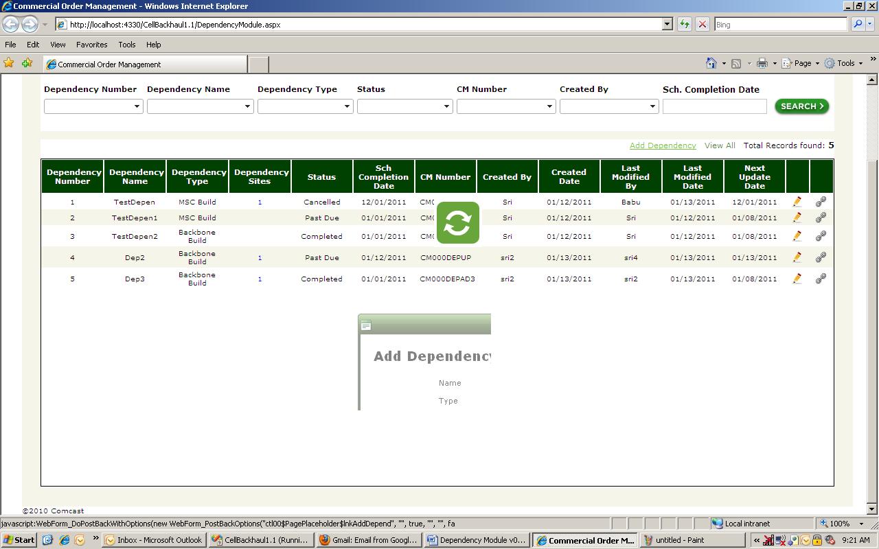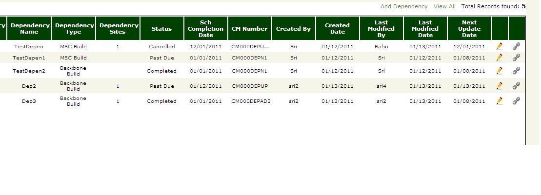 <div style="width: 100%"> <div style="padding-top: 10px; padding-bottom: 25px; padding-left: 25px; padding-right: 25px;"> <table width="100%"> <tr> <td style="width: 100%"> <asp:UpdatePanel ID="updependency" runat="server"> <ContentTemplate> <table width="100%" cellpadding="0" cellspacing="0"> <tr runat="server"> <td valign="top" style="width: 100%; height: 502px" align="left"> <div id="divRec" visible="false" runat="server" style="width: 100%;"> <table width="100%" cellpadding="0" cellspacing="0"> <tr style="background-color: White;"> <td align="left" style="overflow: auto; height: 480px; width: 100%"> <div id="divGrid" runat="server" style="overflow: auto; height: 480px; width: 100%"> <telerik:radgrid id="rgDependency" runat="server" height="476px" gridlines="None" showgrouppanel="false" showfooter="false" autogeneratecolumns="false" enableembeddedskins="false" allowpaging="true" pagesize="20" borderstyle="Solid" bordercolor="Black" borderwidth="1px" backcolor="White" onitemcommand="rgDependency_ItemCommand" onitemdatabound="rgDependency_ItemDataBound" onneeddatasource="rgDependency_NeedDataSource"> <HeaderStyle Height="20px" BackColor="#004000" Font-Size="8pt" Font-Bold="True" ForeColor="White" HorizontalAlign="Center" BorderColor="White" BorderWidth="1px" /> <ItemStyle HorizontalAlign="Center" /> <AlternatingItemStyle BackColor="#F5F5E9" HorizontalAlign="Center" /> <PagerStyle BackColor="#F5F5E9" /> <MasterTableView DataKeyNames="DependencyNumber" GridLines="None"> <Columns> <telerik:GridBoundColumn HeaderText="Dependency Number" DataField="DependencyNumber" UniqueName="DependencyNumber"> </telerik:GridBoundColumn> <telerik:GridBoundColumn HeaderText="Dependency Name" DataField="DependencyName" UniqueName="DependencyName"> </telerik:GridBoundColumn> <telerik:GridBoundColumn HeaderText="Dependency Type" DataField="DependencyType" UniqueName="DependencyType"> </telerik:GridBoundColumn> <telerik:GridTemplateColumn HeaderText="Dependency Sites" DataField="DependencySites" UniqueName="DependencySites"> <ItemTemplate> <asp:LinkButton ID="lnkDepenSites" Text='<%# Bind("DependencySites") %>' runat="server" CommandName="Orders" ForeColor="Blue"></asp:LinkButton> </ItemTemplate> </telerik:GridTemplateColumn> <telerik:GridBoundColumn HeaderText="Status" DataField="DependencyStatus" UniqueName="DependencyStatus"> </telerik:GridBoundColumn> <telerik:GridBoundColumn HeaderText="Sch Completion Date" DataField="ScheduleCompletionDate" UniqueName="ScheduleCompletionDate" DataFormatString="{0:MM/dd/yyyy}"> </telerik:GridBoundColumn> <telerik:GridBoundColumn HeaderText="CM Number" DataField="CMNumber" UniqueName="CMNumber"> </telerik:GridBoundColumn> <telerik:GridBoundColumn HeaderText="Created By" DataField="CreatedBY" UniqueName="CreatedBY"> </telerik:GridBoundColumn> <telerik:GridBoundColumn HeaderText="Created Date" DataField="CreatedDate" UniqueName="CreatedDate" DataFormatString="{0:MM/dd/yyyy}"> </telerik:GridBoundColumn> <telerik:GridBoundColumn HeaderText="Last Modified By" DataField="LastModifiedBy" UniqueName="LastModifiedBy"> </telerik:GridBoundColumn> <telerik:GridBoundColumn HeaderText="Last Modified Date" DataField="LastModifiedDate" UniqueName="LastModifiedDate" DataFormatString="{0:MM/dd/yyyy}"> </telerik:GridBoundColumn> <telerik:GridBoundColumn HeaderText="Next Update Date" DataField="NextUpdateDate" UniqueName="NextUpdateDate" DataFormatString="{0:MM/dd/yyyy}"> </telerik:GridBoundColumn> <telerik:GridButtonColumn UniqueName="EditDependency" CommandName="EditDependency" ImageUrl="~/Images/edit-icon-v5.gif" ButtonType="ImageButton" HeaderStyle-Width="3%" ItemStyle-Width="3%"> </telerik:GridButtonColumn> <telerik:GridButtonColumn UniqueName="Associate" CommandName="Associate" ImageUrl="~/Images/Associate.png" ButtonType="ImageButton" HeaderStyle-Width="3%" ItemStyle-Width="3%"> </telerik:GridButtonColumn> </Columns> <NoRecordsTemplate> No Dependencies found</NoRecordsTemplate> </MasterTableView> <ClientSettings> <Scrolling AllowScroll="true" ScrollHeight="400px" UseStaticHeaders="true" /> </ClientSettings> </telerik:radgrid> </div> </td> </tr> </table> </div> </td> </tr> </table> </ContentTemplate> </asp:UpdatePanel> </td> </tr> </table> <asp:UpdateProgress ID="UpdateProgress1" DisplayAfter="1" AssociatedUpdatePanelID="updependency" runat="server"> <ProgressTemplate> <iframe frameborder="0" src="about:blank" class="iframestyle"></iframe> <div class="iframeDiv"> <img src="Images/rotate_large.gif" alt="" /> </div> <div> </div> </ProgressTemplate> </asp:UpdateProgress> <telerik:radwindowmanager id="RadWinmanager" runat="server"> <Windows> <telerik:RadWindow ID="rwAddDepend" runat="server" Behaviors="Default" CustomCSS="CSS/CustomStyle.css" ShowContentDuringLoad="false" BackColor="Green" Animation="FlyIn" Skin="Forest" Height="320px" Width="500px"> <ContentTemplate> //Content Here removed for convenience </ContentTemplate> </telerik:RadWindow> <telerik:RadWindow ID="rwEditDepend" runat="server" Behaviors="Default" CustomCSS="CSS/CustomStyle.css" ShowContentDuringLoad="false" BackColor="Green" Animation="FlyIn" Skin="Forest" Height="320px" Width="500px" Title="Add Dependency Mockup"> <ContentTemplate> //Content Here removed for convenience </ContentTemplate> </telerik:RadWindow> <telerik:RadWindow ID="rwAssociate" runat="server" Behaviors="Default" CustomCSS="CSS/CustomStyle.css" ShowContentDuringLoad="false" BackColor="Green" Animation="FlyIn" Skin="Forest" Width="1050px" Height="500px"> <ContentTemplate> //Content Here removed for convenience </ContentTemplate> </telerik:RadWindow> </Windows> </telerik:radwindowmanager> </div> </div>