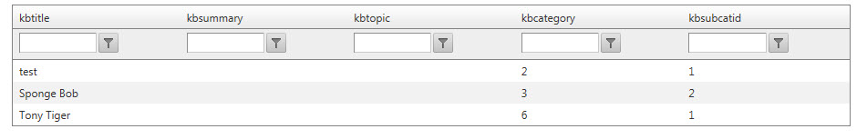 So, now I want to display my data in a grid, but I don't want to show the numeric values of the drop-down columns. I want their respective textual values: like apples or bananas. As you can see from my screenshot I am only showing numbers in the columns named "kbcategory" and "kbsubcatid".