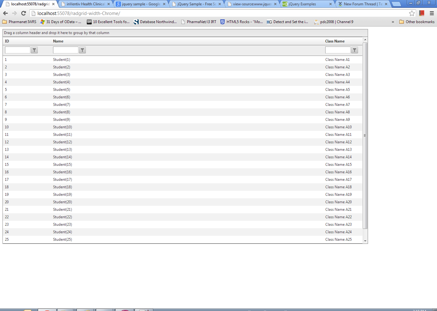 using System;using System.Collections.Generic;using System.Linq;using System.Web;using System.Web.UI;using System.Web.UI.WebControls;using Telerik.Web.UI;public partial class _Default : System.Web.UI.Page{ protected void Page_Load(object sender, EventArgs e) { Page.ClientScript.RegisterStartupScript(this.GetType(), "RADGrid", string.Format("rdgrdGenericReportClientID='{0}';", rdgrdGenericReport.ClientID), true); } protected void rdgrdGenericReport_NeedDataSource(object source, GridNeedDataSourceEventArgs e) { BO bo = new BO(); rdgrdGenericReport.DataSource = bo.GetStudent(); } protected void rdgrdGenericReport_ColumnCreated(object sender, GridColumnCreatedEventArgs e) { e.Column.HeaderStyle.Width = Unit.Pixel(100); }}public class BO{ public List<Student> GetStudent() { List<Student> students = new List<Student>(); for (int counter = 1; counter <= 45; counter++) { students.Add(new Student(counter.ToString(), string.Format("Student({0})", counter), string.Format("Class Name A{0}", counter), string.Format("Marks 10{0}", counter), string.Format("Student Rank is {0}", counter) )); } return students; }}public class Student{ public Student(string id, string name, string className, string marks, string rank) { ID = id; Name = name; ClassName = className; Marks = marks; Rank = rank; } public string ID { get; set; } public string Name { get; set; } public string ClassName { get; set; } public string Marks { get; set; } public string Rank { get; set; }}Please find attached same sample code without telerik dll.