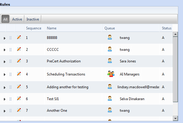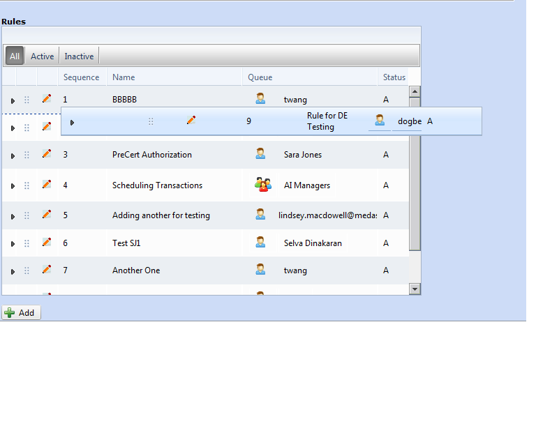 <telerik:RadGrid AllowPaging="False" AllowSorting="False" AutoGenerateColumns="False" cssClass="Grid" ID="grdWorkDistrRules" ItemPlaceholderID="RulesContainer" OnDetailTableDataBind="grdWorkDistrRules_DetailTableDataBind" OnRowDrop="grdWorkDistrRules_RowDrop" OnItemDataBound="grdWorkDistrRules_OnItemDataBound" OnNeedDataSource="grdWorkDistrRules_OnNeedDataSource" OnItemCommand="grdWorkDistrRules_ItemCommand" runat="server" ShowGroupPanel="True" Skin="Windows7" Width="600"> <MasterTableView DataKeyNames="Id" GroupLoadMode="Server" CommandItemDisplay="Top"> <CommandItemTemplate> <telerik:RadToolBar ID="tbRules" runat="server" Width="100%" OnButtonClick="RadToolBar1_ButtonClick" OnPreRender="tbRules_PreRender"> <Items> <telerik:RadToolBarButton Text="All" CommandName="ShowAll" CheckOnClick="true" Value="ShowAll" Group="Rules" ></telerik:RadToolBarButton> <telerik:RadToolBarButton IsSeparator="true"></telerik:RadToolBarButton> <telerik:RadToolBarButton Text="Active" CommandName="ShowActive" CheckOnClick="true" Value="ShowActive" Group="Rules"> </telerik:RadToolBarButton> <telerik:RadToolBarButton IsSeparator="true"></telerik:RadToolBarButton> <telerik:RadToolBarButton Text="Inactive" CommandName="ShowInactive" CheckOnClick="true" Value="ShowInactive" Group="Rules"></telerik:RadToolBarButton> <telerik:RadToolBarButton IsSeparator="true"></telerik:RadToolBarButton> </Items> </telerik:RadToolBar> </CommandItemTemplate> <Columns> <telerik:GridDragDropColumn HeaderStyle-Width="30px" Visible="true" /> <telerik:GridEditCommandColumn UniqueName="EditRule" ButtonType="ImageButton" HeaderStyle-Width="30px" /> <telerik:GridBoundColumn UniqueName="Sequence" DataField="Sequence" HeaderText="Sequence" HeaderStyle-Width="70" /> <telerik:GridBoundColumn UniqueName="Name" DataField="Name" HeaderText="Name" /> <telerik:GridTemplateColumn HeaderText="Queue" > <ItemTemplate> <uc:WorkItemQueue id="ctlWorkItemQueue" runat="server" /> </ItemTemplate> </telerik:GridTemplateColumn> <telerik:GridBoundColumn UniqueName="Status" DataField="IsActive" HeaderText="Status" HeaderStyle-Width="45"/> </Columns> <NestedViewSettings > <ParentTableRelation> <telerik:GridRelationFields DetailKeyField="Id" MasterKeyField="Id" /> </ParentTableRelation> </NestedViewSettings> <NestedViewTemplate> <asp:Panel ID="NestedViewPanel" runat="server" > <div > <fieldset style="padding: 10px;"> <table style="float:left;text-align:top;" > <tr> <td> Facilities:</td> <td><%# PopulateFacilities(Eval("Id").ToString())%></td> </tr> <tr> <td colspan="4">Created by <%# Eval("CreatedBy")%>, <%# Eval("CreatedOn") %></td> </tr> <tr> <td colspan="4">Modified by <%# Eval("ModifiedBy")%>, <%# Eval("ModifiedOn") %></td> </tr> </table> </fieldset> </div> </asp:Panel> </NestedViewTemplate> </MasterTableView> <ClientSettings AllowRowsDragDrop="true"> <Selecting AllowRowSelect="True" EnableDragToSelectRows="true"/> <Scrolling AllowScroll="true" UseStaticHeaders="true" /> </ClientSettings> </telerik:RadGrid>