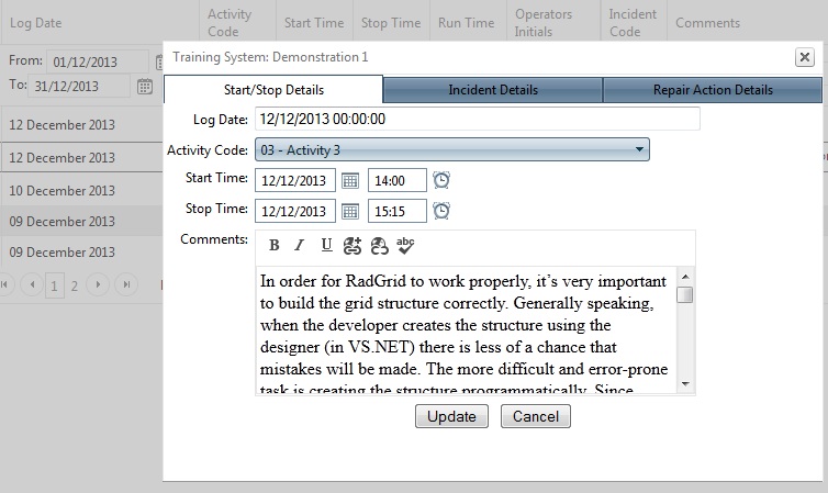 <%@ Control Language="VB" AutoEventWireup="false" CodeFile="WebUserControl.ascx.vb" Inherits="user_WebUserControl" %><%@ Register TagPrefix="telerik" Namespace="Telerik.Web.UI" Assembly="Telerik.Web.UI" %><telerik:RadScriptBlock runat="server" ID="RadCodeBlock1"> <script type="text/javascript"> var RadTimePicker1; var RadTimePicker2; function GetRadWindow() { var oWindow = null; if (window.radWindow) oWindow = window.radWindow; //Will work in Moz in all cases, including clasic dialog else if (window.frameElement.radWindow) oWindow = window.frameElement.radWindow; //IE (and Moz as well) return oWindow; } function ConfirmCloseForm() { //if (confirm('Closing the form will abandon any unsaved changes, OK to close?')) { GetRadWindow().close(); //} } function CloseForm() { GetRadWindow().close(); } function ValidateStart(sender, args) { var Date1 = new Date(dp_StartDate.get_selectedDate()); var Time1 = new Date(tp_StartTime.get_selectedDate()); args.IsValid = true; if (Date1.getTime() < 1) { alert("The Start date is required"); args.IsValid = false; } if (Time1.getTime() < 1) { alert("The Start time is required"); args.IsValid = false; } } function ValidateTimes(sender, args) { var Date1 = new Date(dp_StartDate.get_selectedDate()); var Date2 = new Date(dp_StopDate.get_selectedDate()); var Time1 = new Date(tp_StartTime.get_selectedDate()); var Time2 = new Date(tp_StopTime.get_selectedDate()); args.IsValid = true; if (Date2.getTime() < Date1.getTime()) { alert("The Stop date and time should be greater than the Start time"); args.IsValid = false; } else { if ((Date2.getTime() == Date1.getTime()) && (Time2 < Time1)) { alert("The Stop date and time should be greater than the Start time"); args.IsValid = false; } } } function onLoadStartDate(sender, args) { dp_StartDate = sender; } function onLoadStartTime(sender, args) { tp_StartTime = sender; } function onLoadStopDate(sender, args) { dp_StopDate = sender; } function onLoadStopTime(sender, args) { tp_StopTime = sender; } </script></telerik:RadScriptBlock><telerik:RadTabStrip runat="server" ID="RadTabStrip1" MultiPageID="RadMultiPage1" SelectedIndex="0"> <Tabs> <telerik:RadTab Text="Start/Stop Details" Width="200px"></telerik:RadTab> <telerik:RadTab Text="Incident Details" Width="200px"></telerik:RadTab> <telerik:RadTab Text="Repair Action Details" Width="200px"></telerik:RadTab> </Tabs></telerik:RadTabStrip><telerik:RadMultiPage runat="server" ID="RadMultiPage1" SelectedIndex="0" CssClass="outerMultiPage"> <telerik:RadPageView runat="server" ID="pv_StartStop"> <table id="Table3" cellspacing="3" cellpadding="3" width="300" border="0"> <tr> <td style="text-align:right"> Log Date: </td> <td style="white-space:nowrap"> <asp:TextBox ID="txt_LogDate" runat="server" Text='<%# DataBinder.Eval( Container, "DataItem.LogDate" ) %>' Width="30em"></asp:TextBox> </td> <td> </td> </tr> <tr> <td style="text-align:right"> Activity Code: </td> <td style="white-space:nowrap"> <telerik:RadDropDownList runat="server" ID="cbo_ActivityCode" DataValueField="Activity_id" DataTextField="ActivityCodeDesc" DataSourceID="ds_ActivityCodes" Width="30em"> </telerik:RadDropDownList> <asp:RequiredFieldValidator ID="RequiredFieldValidator2" ControlToValidate="cbo_ActivityCode" ErrorMessage="Please select an Activity Code" ForeColor="Red" runat="server">*</asp:RequiredFieldValidator> </td> <td> </td> </tr> <tr> <td align="right" valign="top"> <asp:label ID="lbl_StartTime" Text="Start Time:" runat="server"></asp:label> </td> <td> <telerik:RadDatePicker ID="dp_StartDate" Width="100px" runat="server"> <DateInput ID="DateInput1" runat="server"> <ClientEvents OnLoad="onLoadStartDate"></ClientEvents> </DateInput> </telerik:RadDatePicker> <telerik:RadTimePicker ID="tp_StartTime" Width="80px" runat="server"> <DateInput ID="DateInput2" runat="server"> <ClientEvents OnLoad="onLoadStartTime"></ClientEvents> </DateInput> <TimeView ID="TimeView1" Interval="00:30:00" Columns="6" runat="server"></TimeView> </telerik:RadTimePicker> <asp:CustomValidator ID="val_StartDate" EnableClientScript="true" ControlToValidate="dp_StartDate" ClientValidationFunction="ValidateStart" ForeColor="Red" runat="server">*</asp:CustomValidator> <asp:CustomValidator ID="val_StartTime" EnableClientScript="true" ControlToValidate="tp_StartTime" ClientValidationFunction="ValidateStart" ForeColor="Red" runat="server">*</asp:CustomValidator> </td> <td> </td> </tr> <tr> <td align="right" valign="top"> <asp:label ID="lbl_StopTime" Text="Stop Time:" runat="server"></asp:label> </td> <td> <telerik:RadDatePicker ID="dp_StopDate" Width="100px" runat="server"> <DateInput ID="DateInput3" runat="server"> <ClientEvents OnLoad="onLoadStopDate"></ClientEvents> </DateInput> </telerik:RadDatePicker> <telerik:RadTimePicker ID="tp_StopTime" Width="80px" runat="server"> <DateInput ID="DateInput4" runat="server"> <ClientEvents OnLoad="onLoadStopTime"></ClientEvents> </DateInput> <TimeView ID="TimeView2" Interval="00:30:00" Columns="6" runat="server"></TimeView> </telerik:RadTimePicker> <asp:CustomValidator ID="val_StopDate" EnableClientScript="true" ControlToValidate="dp_StopDate" ClientValidationFunction="ValidateTimes" ForeColor="Red" runat="server">*</asp:CustomValidator> <asp:CustomValidator ID="val_StopTime" EnableClientScript="true" ControlToValidate="tp_StopTime" ClientValidationFunction="ValidateTimes" ForeColor="Red" runat="server">*</asp:CustomValidator> </td> <td> </td> </tr> <tr> <td align="right" valign="top"> <asp:label ID="lbl_Comment" Text="Comments:" runat="server"></asp:label> </td> <td> <telerik:RadEditor ID="RE_ProgComment" Width="400px" Height="150px" EditModes="Design" Skin="Metro" runat="server"> <Tools> <telerik:EditorToolGroup> <telerik:EditorTool Name="Bold"></telerik:EditorTool> <telerik:EditorTool Name="Italic"></telerik:EditorTool> <telerik:EditorTool Name="Underline"></telerik:EditorTool> <telerik:EditorTool Name="InsertLink"></telerik:EditorTool> <telerik:EditorTool Name="Unlink"></telerik:EditorTool> <telerik:Edi