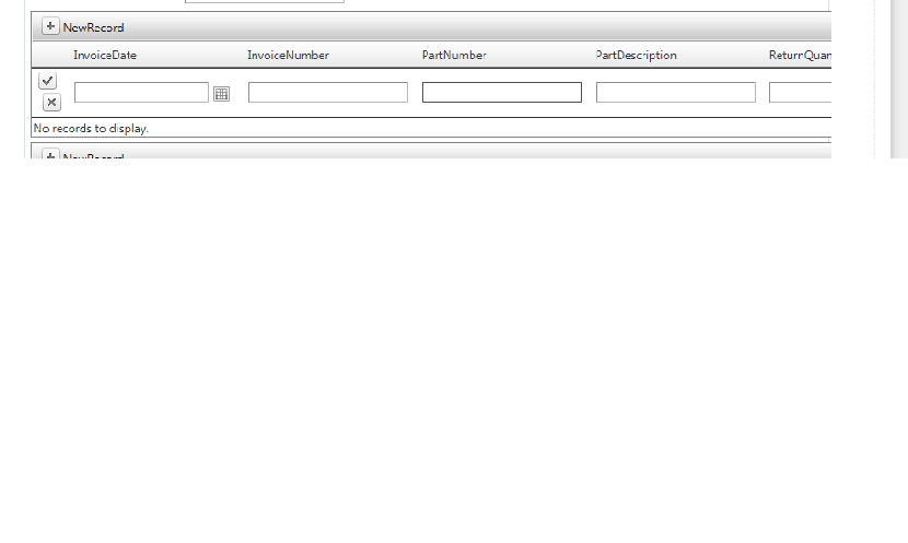 <telerik:RadGrid ID="grdComprehensiveParts" AutoGenerateColumns="false" AllowSorting="True" PageSize="7" AllowPaging="True" runat="server" AllowAutomaticUpdates="false" OnItemCommand="grdComprehensiveParts_ItemCommand" AllowAutomaticInserts="false" OnInsertCommand="grdComprehensiveParts_InsertCommand" OnUpdateCommand="grdComprehensiveParts_UpdateCommand"> <PagerStyle Mode="NextPrevAndNumeric"></PagerStyle> <MasterTableView CssClass="TableviewStle" HeaderStyle-CssClass="GridHeaderStyle" CommandItemDisplay="Top" AutoGenerateColumns="false" DataKeyNames="ComprehensivePartNo" EditMode="InPlace" ItemStyle-CssClass="GridItemStyle" EditItemStyle-CssClass="GridItemStyle"> <CommandItemSettings AddNewRecordText="NewRecord" ShowRefreshButton="false" /> <Columns> <telerik:GridEditCommandColumn ButtonType="ImageButton" UniqueName="EditCommandColumn"> <ItemStyle CssClass="MyImageButton"></ItemStyle> </telerik:GridEditCommandColumn> <telerik:GridTemplateColumn HeaderText="InvoiceDate"> <EditItemTemplate> <telerik:RadDatePicker runat="server" ID="dpInvoiceDate" DbSelectedDate='<%#Eval("InvoiceDate")%>'> </telerik:RadDatePicker> </EditItemTemplate> <ItemTemplate> <asp:Label runat="server" ID="lblInvoiceDate" Text='<%#Eval("InvoiceDate")%>'></asp:Label> </ItemTemplate> </telerik:GridTemplateColumn> <telerik:GridTemplateColumn HeaderText="InvoiceNumber"> <EditItemTemplate> <telerik:RadTextBox CssClass="GridEditTextbox" runat="server" ID="txtInvoiceNumber" Text='<%#Eval("InvoiceNumber") %>'> </telerik:RadTextBox> </EditItemTemplate> <ItemTemplate> <asp:Label runat="server" ID="lblLength" CssClass="GridLabelStyle" Text='<%#Eval("InvoiceNumber")%>'></asp:Label> </ItemTemplate> </telerik:GridTemplateColumn> <telerik:GridTemplateColumn HeaderText="PartNumber"> <EditItemTemplate> <telerik:RadTextBox CssClass="GridEditTextbox" runat="server" ID="txtPartNumber" Text='<%#Eval("PartNumber") %>'> </telerik:RadTextBox> </EditItemTemplate> <ItemTemplate> <asp:Label runat="server" ID="lblPartNumber" CssClass="GridEditTextbox" Text='<%#Eval("PartNumber")%>'></asp:Label> </ItemTemplate> </telerik:GridTemplateColumn> <telerik:GridTemplateColumn HeaderText="PartDescription"> <EditItemTemplate> <telerik:RadTextBox runat="server" ID="txtPartDescription" CssClass="GridEditTextbox" Text='<%#Eval("PartDescription") %>'> </telerik:RadTextBox> </EditItemTemplate> <ItemTemplate> <asp:Label runat="server" ID="lblPartDescription" Text='<%#Eval("PartDescription")%>'></asp:Label> </ItemTemplate> </telerik:GridTemplateColumn> <telerik:GridTemplateColumn HeaderText="ReturnQuantity"> <EditItemTemplate> <telerik:RadNumericTextBox runat="server" ID="txtReturnQuantity" CssClass="GridEditTextbox" Text='<%#Eval("ReturnQuantity") %>'> </telerik:RadNumericTextBox> </EditItemTemplate> <ItemTemplate> <asp:Label runat="server" ID="lblReturnQuantity" CssClass="GridEditTextbox" Text='<%#Eval("ReturnQuantity")%>'></asp:Label> </ItemTemplate> </telerik:GridTemplateColumn> <telerik:GridTemplateColumn HeaderText="ReturnDesc"> <EditItemTemplate> <telerik:RadTextBox runat="server" ID="txtReturnDesc" Text='<%#Eval("ReturnDesc") %>'> </telerik:RadTextBox> </EditItemTemplate> <ItemTemplate> <asp:Label runat="server" ID="lblReturnDesc" CssClass="GridEditTextbox" Text='<%#Eval("ReturnDesc")%>'></asp:Label> </ItemTemplate> </telerik:GridTemplateColumn> <telerik:GridButtonColumn ConfirmText="Delete this product?" ConfirmDialogType="RadWindow" ConfirmTitle="Delete" ImageUrl="../Vital Software Pty Ltd_files/Delete.gif" ButtonType="ImageButton" CommandName="Delete" Text="Delete" UniqueName="DeleteColumn"> <ItemStyle HorizontalAlign="Center" CssClass="MyImageButton"></ItemStyle> </telerik:GridButtonColumn> </Columns> </MasterTableView> <ClientSettings> <ClientEvents OnRowDblClick="RowDblClick1"></ClientEvents> </ClientSettings> </telerik:RadGrid>