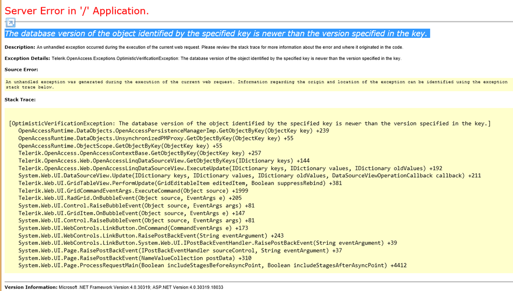 Exception Details: Telerik.OpenAccess.Exceptions.OptimisticVerificationException: The database version of the object identified by the specified key is newer than the version specified in the key.
