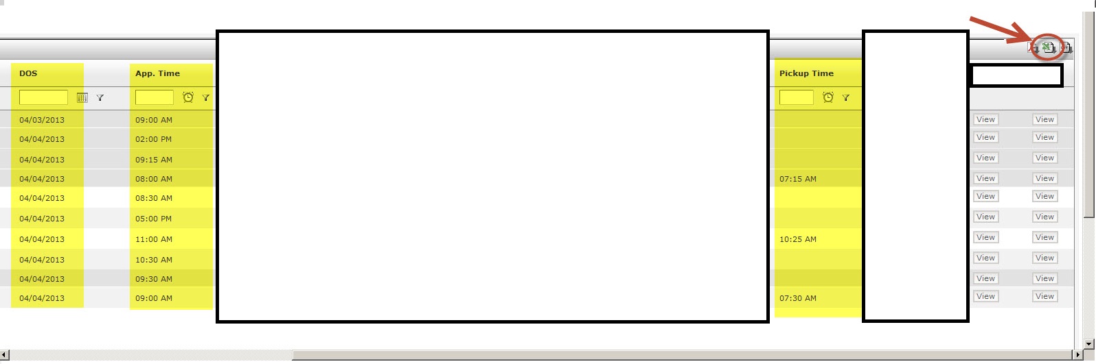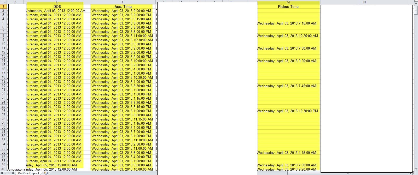 The format of DOS, follow up date, appt time and pick up time when exporting to excel (pic 2) should have the same format as in the (pic 1)