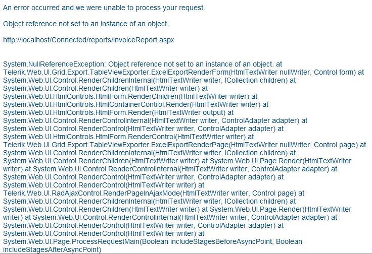 System.NullReferenceException: Object reference not set to an instance of an object. at Telerik.Web.UI.Grid.Export.TableViewExporter.ExcelExportRenderForm(HtmlTextWriter nullWriter, Control form) at System.Web.UI.Control.RenderChildrenInternal(HtmlTextWriter writer, ICollection children) at System.Web.UI.Control.RenderChildren(HtmlTextWriter writer) at System.Web.UI.HtmlControls.HtmlForm.RenderChildren(HtmlTextWriter writer) at System.Web.UI.HtmlControls.HtmlContainerControl.Render(HtmlTextWriter writer) at System.Web.UI.HtmlControls.HtmlForm.Render(HtmlTextWriter output) at System.Web.UI.Control.RenderControlInternal(HtmlTextWriter writer, ControlAdapter adapter) at System.Web.UI.Control.RenderControl(HtmlTextWriter writer, ControlAdapter adapter) at System.Web.UI.HtmlControls.HtmlForm.RenderControl(HtmlTextWriter writer) at Telerik.Web.UI.Grid.Export.TableViewExporter.ExcelExportRenderPage(HtmlTextWriter nullWriter, Control page) at System.Web.UI.Control.RenderChildrenInternal(HtmlTextWriter writer, ICollection children) at System.Web.UI.Control.RenderChildren(HtmlTextWriter writer) at System.Web.UI.Page.Render(HtmlTextWriter writer) at System.Web.UI.Control.RenderControlInternal(HtmlTextWriter writer, ControlAdapter adapter) at System.Web.UI.Control.RenderControl(HtmlTextWriter writer, ControlAdapter adapter) at System.Web.UI.Control.RenderControl(HtmlTextWriter writer) at System.Web.UI.Page.ProcessRequestMain(Boolean includeStagesBeforeAsyncPoint, Boolean includeStagesAfterAsyncPoint)