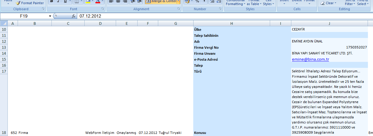 <table width="600" class="MsoNormalTable" style="width: 450pt; mso-cellspacing: .7pt; mso-yfti-tbllook: 1184; mso-padding-alt: 0cm 0cm 0cm 0cm;" border="0" cellspacing="1" cellpadding="0"> <tbody> <tr style="mso-yfti-irow: 0; mso-yfti-firstrow: yes;"> <td style="padding-bottom: 0.75pt; padding-left: 0.75pt; width: 20%; padding-right: 0.75pt; background: #cee7ff; padding-top: 0.75pt;border: #f0f0f0;"><b>Ülke<o:p _rdEditor_exists="1"></o:p></b></td> <td style="padding-bottom: 0.75pt; padding-left: 0.75pt; padding-right: 0.75pt; background: aliceblue; padding-top: 0.75pt;border: #f0f0f0;">CEZAYİR<o:p _rdEditor_exists="1"></o:p></td> </tr> <tr style="mso-yfti-irow: 1;"> <td style="padding-bottom: 0.75pt; padding-left: 0.75pt; padding-right: 0.75pt; background: #cee7ff; padding-top: 0.75pt;border: #f0f0f0;" colspan="2"><b>Talep Sahibinin<o:p _rdEditor_exists="1"></o:p></b></td> </tr> <tr style="mso-yfti-irow: 2;"> <td style="padding-bottom: 0.75pt; padding-left: 0.75pt; padding-right: 0.75pt; background: #cee7ff; padding-top: 0.75pt;border: #f0f0f0;"><b>Adı<o:p _rdEditor_exists="1"></o:p></b></td> <td style="padding-bottom: 0.75pt; padding-left: 0.75pt; padding-right: 0.75pt; background: aliceblue; padding-top: 0.75pt;border: #f0f0f0;">EMİNE AYDIN ÜNAL<o:p _rdEditor_exists="1"></o:p></td> </tr> <tr style="mso-yfti-irow: 3;"> <td style="padding-bottom: 0.75pt; padding-left: 0.75pt; padding-right: 0.75pt; background: #cee7ff; padding-top: 0.75pt;border: #f0f0f0;"><b>Firma Vergi No<o:p _rdEditor_exists="1"></o:p></b></td> <td style="padding-bottom: 0.75pt; padding-left: 0.75pt; padding-right: 0.75pt; background: aliceblue; padding-top: 0.75pt;border: #f0f0f0;">1750352027<o:p _rdEditor_exists="1"></o:p></td> </tr> <tr style="mso-yfti-irow: 4;"> <td style="padding-bottom: 0.75pt; padding-left: 0.75pt; padding-right: 0.75pt; background: #cee7ff; padding-top: 0.75pt;border: #f0f0f0;"><b>Firma Unvanı<o:p _rdEditor_exists="1"></o:p></b></td> <td style="padding-bottom: 0.75pt; padding-left: 0.75pt; padding-right: 0.75pt; background: aliceblue; padding-top: 0.75pt;border: #f0f0f0;">BİNA YAPI SANAYİ VE TİCARET LTD. ŞTİ.<o:p _rdEditor_exists="1"></o:p></td> </tr> <tr style="mso-yfti-irow: 5;"> <td style="padding-bottom: 0.75pt; padding-left: 0.75pt; padding-right: 0.75pt; background: #cee7ff; padding-top: 0.75pt;border: #f0f0f0;"><b>e-Posta Adresi<o:p _rdEditor_exists="1"></o:p></b></td> <td style="padding-bottom: 0.75pt; padding-left: 0.75pt; padding-right: 0.75pt; background: aliceblue; padding-top: 0.75pt;border: #f0f0f0;"><a href="mailto:emine@bina.com.tr"><span style="color: #0000ff; text-decoration: underline;">emine@bina.com.tr</span></a><o:p _rdEditor_exists="1"></o:p></td> </tr> <tr style="mso-yfti-irow: 6;"> <td style="padding-bottom: 0.75pt; padding-left: 0.75pt; padding-right: 0.75pt; background: #cee7ff; padding-top: 0.75pt;border: #f0f0f0;" colspan="2"><b>Talep<o:p _rdEditor_exists="1"></o:p></b></td> </tr> <tr style="mso-yfti-irow: 7;"> <td style="padding-bottom: 0.75pt; padding-left: 0.75pt; padding-right: 0.75pt; background: #cee7ff; padding-top: 0.75pt;border: #f0f0f0;"><b>Türü<o:p _rdEditor_exists="1"></o:p></b></td> <td style="padding-bottom: 0.75pt; padding-left: 0.75pt; padding-right: 0.75pt; background: aliceblue; padding-top: 0.75pt;border: #f0f0f0;">Sektörel İthalatçı Adresi Talep Ediyorum...<o:p _rdEditor_exists="1"></o:p></td> </tr> <tr style="mso-yfti-irow: 8; mso-yfti-lastrow: yes;"> <td style="padding-bottom: 0.75pt; padding-left: 0.75pt; padding-right: 0.75pt; background: #cee7ff; padding-top: 0.75pt;border: #f0f0f0;"><b>Konusu<o:p _rdEditor_exists="1"></o:p></b></td> <td style="padding-bottom: 0.75pt; padding-left: 0.75pt; padding-right: 0.75pt; background: aliceblue; padding-top: 0.75pt;border: #f0f0f0;">Firmamız İnşaat Sektöründe Dekoratif ve İzolasyon Malz. üretmektedir ve 25 ten fazla ülkeye satış yapmaktadır. Ne yazık ki henüz Cezaire satış yapamadık. Bu konuda bize destek verebilirseniz çok memnun oluruz. Cezair de bulunan Expanded Polystyrene (EPS)üreticileri ve İnşaat veya Yalıtım Malz. Satıcıları-İnşaat Maz. Toptancılarına ve İnşaat ve Mütaitlik firmalarına ulaşmamızda yardımcı olursanız çok memnun oluruz. G.T.I.P. numaralarımız: 3921110000 ve 3925908009 Saygılarımla <o:p _rdEditor_exists="1"></o:p></td> </tr> </tbody> </table>0
