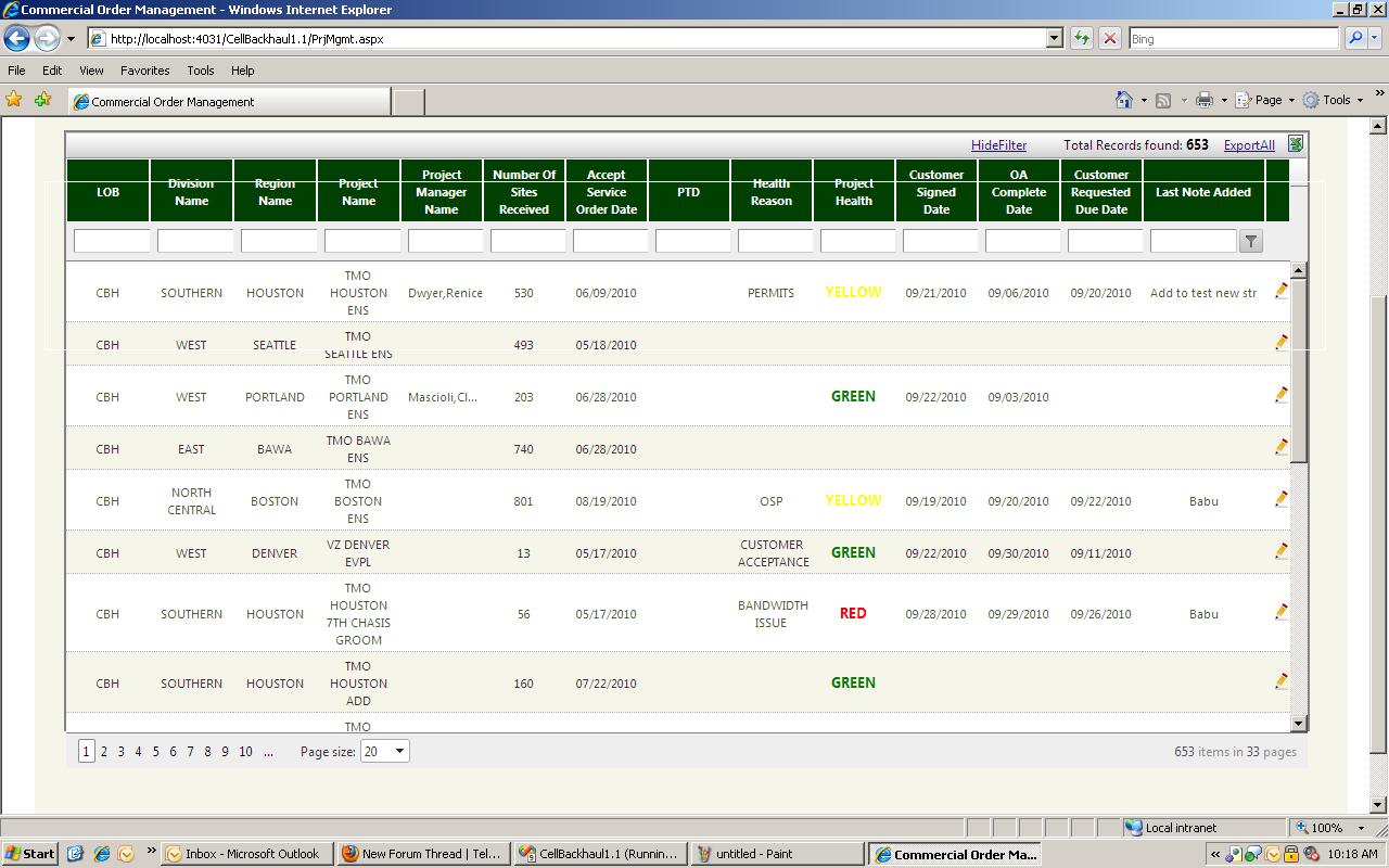 <div style="width: 100%; height: 650px; overflow: auto; overflow-y: hidden"> <telerik:RadGrid ID="gvPjtMnt" runat="server" Height="550px" Width="99%" AutoGenerateColumns="false" BorderWidth="2px" BorderStyle="Solid" BackColor="White" AllowPaging="True" PagerStyle-AlwaysVisible="true" PageSize="20" AllowSorting="True" AllowFilteringByColumn="true" OnNeedDataSource="gvPjtMnt_OnNeedDataSource" OnItemCommand="gvPjtMnt_ItemCommand" OnItemCreated="gvPjtMnt_ItemCreated" OnItemDataBound="gvPjtMnt_ItemDataBound"> <HeaderStyle Height="20px" BackColor="#004000" Font-Size="8pt" Font-Bold="True" ForeColor="White" HorizontalAlign="Center" BorderColor="White" BorderWidth="1px" /> <AlternatingItemStyle Font-Size="8pt" BackColor="#F5F5E9" HorizontalAlign="Center" BorderWidth="1px" BorderColor="White" /> <ItemStyle HorizontalAlign="Center" /> <ExportSettings ExportOnlyData="true" IgnorePaging="true" FileName="Project Management"> </ExportSettings> <MasterTableView GridLines="None" CommandItemDisplay="Top" DataKeyNames="ProjectId" HorizontalAlign="Center" AllowFilteringByColumn="true"> <CommandItemTemplate> <table style="width: 100%"> <tr> <td align="right" style="width: 78%"> <asp:LinkButton ID="lnkshwFilter" Text="ShowFilter" Font-Underline="true" ForeColor="MidnightBlue" runat="server" OnClientClick="return showFilterItem()" /> <asp:LinkButton ID="lnkhdFilter" Text="HideFilter" Font-Underline="true" ForeColor="MidnightBlue" runat="server" OnClientClick="return hideFilterItem()" /> </td> <td align="right" style="height: 10px;"> Total Records found: <asp:Label ID="lblTotRecCount" runat="server" Font-Bold="True" Font-Size="10pt" ForeColor="Black" Text="0"></asp:Label> </td> <td align="right"> <asp:LinkButton ID="lnkExportAll" Text="ExportAll" Font-Underline="true" ForeColor="MidnightBlue" runat="server" OnClick="ExportAll_Click" /> </td> <td align="right" style="width: 2%"> <asp:ImageButton ID="ExportToExcelButton" runat="server" ImageUrl="~/images/ExportToExcel.gif" ToolTip="Export to Excel" OnClick="ExportExcel_Click" /> </td> </tr> </table> </CommandItemTemplate> <Columns> ..... few columns here ............ </Columns> <ItemStyle ForeColor="#3C5F22" Font-Size="8pt" BackColor="White" BorderWidth="0px" BorderColor="White" /> <PagerStyle Mode="NextPrevAndNumeric" AlwaysVisible="true" /> </MasterTableView> <ClientSettings AllowColumnsReorder="true"> <ClientEvents OnGridCreated="GridCreated" /> <Scrolling AllowScroll="true" UseStaticHeaders="true" /> <Resizing AllowColumnResize="true" /> </ClientSettings> </telerik:RadGrid></div>function showFilterItem() { $find('<%=gvPjtMnt.ClientID %>').get_masterTableView().showFilterItem(); document.getElementById('ctl00_PagePlaceholder_gvPjtMnt_ctl00_ctl02_ctl00_lnkhdFilter').style.display = 'block'; document.getElementById('ctl00_PagePlaceholder_gvPjtMnt_ctl00_ctl02_ctl00_lnkshwFilter').style.display = 'none'; return false;}function hideFilterItem() { document.getElementById('ctl00_PagePlaceholder_gvPjtMnt_ctl00_ctl02_ctl00_lnkhdFilter').style.display = 'none'; document.getElementById('ctl00_PagePlaceholder_gvPjtMnt_ctl00_ctl02_ctl00_lnkshwFilter').style.display = 'block'; $find('<%=gvPjtMnt.ClientID %>').get_masterTableView().hideFilterItem(); return false;}function GridCreated(sender, args) { sender.get_masterTableView().hideFilterItem();}14 Answers, 1 is accepted