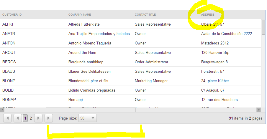 the problem is that a column is skipped: we are not able to see the column "ADDRESS" between "CONTACT TITLE" and "CITY". ( scrollbarclick_03.png )