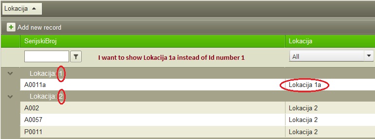 When i want to group using Lokacija column, i am getting field IdLokacije showing me numbers, and i want to show friendly name NazivLokacije.