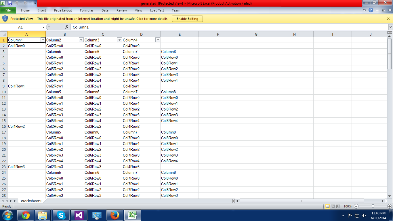 protected void ExportToExcel_Click(object sender, EventArgs e) { RadGrid.ExportSettings.FileName = "filename"; RadGrid.ExportSettings.IgnorePaging = true; RadGrid.ExportSettings.ExportOnlyData = true; RadGrid.ExportSettings.OpenInNewWindow = true; RadGrid.MasterTableView.UseAllDataFields = true; RadGrid.ExportSettings.Excel.Format = GridExcelExportFormat.ExcelML; RadGrid.MasterTableView.HierarchyDefaultExpanded = true; // first level RadGrid.MasterTableView.DetailTables[0].HierarchyDefaultExpanded = true; // second level RadGrid.MasterTableView.ExportToExcel(); }All three grids (master, two detail tables) are set to HierarchyMode = "Client".