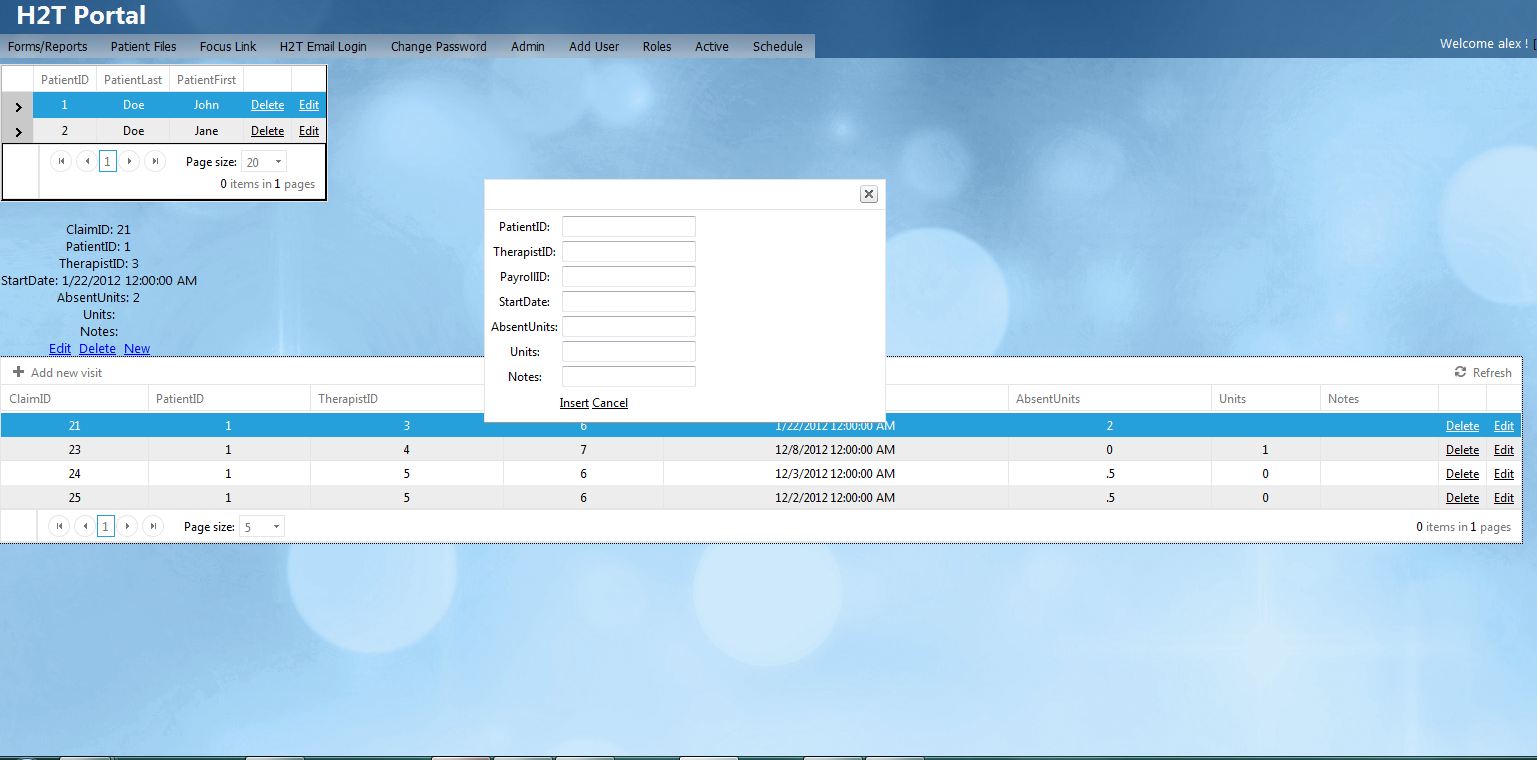 Sorry Now that I take a deeper look I have a few problems. First Problem It does automatically populate the PatientID and it inserts it but it does not inset the rest of the values that I fill out such as units and notes and so on. All it does when I click insert is insert the patient ID. I need it to also insert the values I type in. Second problem is form view I actually forgot to delete that because I actually don't need it so is there a way to populate the patient ID without having form view on this project. One more question I will also need to auto populate the TherapistID by who is logged in by like a profile control not sure that's what it is called. So here is the how this web page will work. Therapist will log in and only see the Patients that are assigned to them. They will be able to click on grid 1 which is the patient list and grid 2 will populate all the visits that the therapist has for that selected patient. they will also be able to add new visits that's where all this comes into play. So when the therapist clicks add new visit this is where patient ID and TherapistID will automatically populate. They don't necessarily need to be visible on the grid I just had them like that because I wanted to see that the IDs where being populated. Hope this makes sense thanks so much for your help.
