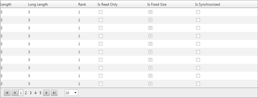 public partial class Test : BasePage{ protected void Page_Load(object sender, EventArgs e) { List<string[]> items = new List<string[]>(50); for (int i=0;i<50;i++) items.Add(new string[3] { "1", "2", "3" }); rgBestellingen.DataSource = items; rgBestellingen.VirtualItemCount = items.Count; rgBestellingen.Rebind(); }}But the grid always renders as in the screenshot. Can anyone help?