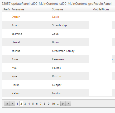 <telerik:RadGrid ID="grdResults" runat="server" Width="100%" Height="430px" PageSize="10" ItemStyle-HorizontalAlign="Left" HeaderStyle-HorizontalAlign="Left" OnItemCommand="grdResults_ItemCommand" OnItemDataBound="grdResults_ItemDataBound" AllowPaging="True" AlternatingItemStyle-HorizontalAlign="Left" ItemStyle-BackColor="#ffffff" AlternatingItemStyle-BackColor="#eeeeee" Visible="true" AutoGenerateColumns="false" OnNeedDataSource="grdResults_NeedDataSource"> <MasterTableView TableLayout="Auto"> <NoRecordsTemplate> <div style="padding: 8px 0 5px 5px; height: 20px; width: 110%;"> There are currently no candidates that match the selection. </div> </NoRecordsTemplate> <Columns> <telerik:GridTemplateColumn HeaderText="Candidate ID" UniqueName="CandidateID" Visible="false"> <ItemTemplate> <%#Eval("CandidateID")%> </ItemTemplate> </telerik:GridTemplateColumn> <telerik:GridTemplateColumn HeaderText="Prefix" HeaderStyle-Width="35px"> <ItemTemplate> <%#Eval("Prefix")%> </ItemTemplate> </telerik:GridTemplateColumn> <telerik:GridTemplateColumn HeaderText="Forename"> <ItemTemplate> <%#Eval("Forename")%> </ItemTemplate> </telerik:GridTemplateColumn> <telerik:GridTemplateColumn HeaderText="Surname"> <ItemTemplate> <%#Eval("Surname")%> </ItemTemplate> </telerik:GridTemplateColumn> <telerik:GridTemplateColumn HeaderText="MobilePhone"> <ItemTemplate> <%#Eval("MobilePhone")%> </ItemTemplate> </telerik:GridTemplateColumn> </Columns> </MasterTableView> <ClientSettings> <Scrolling AllowScroll="True" UseStaticHeaders="True" SaveScrollPosition="true"></Scrolling> </ClientSettings> </telerik:RadGrid>