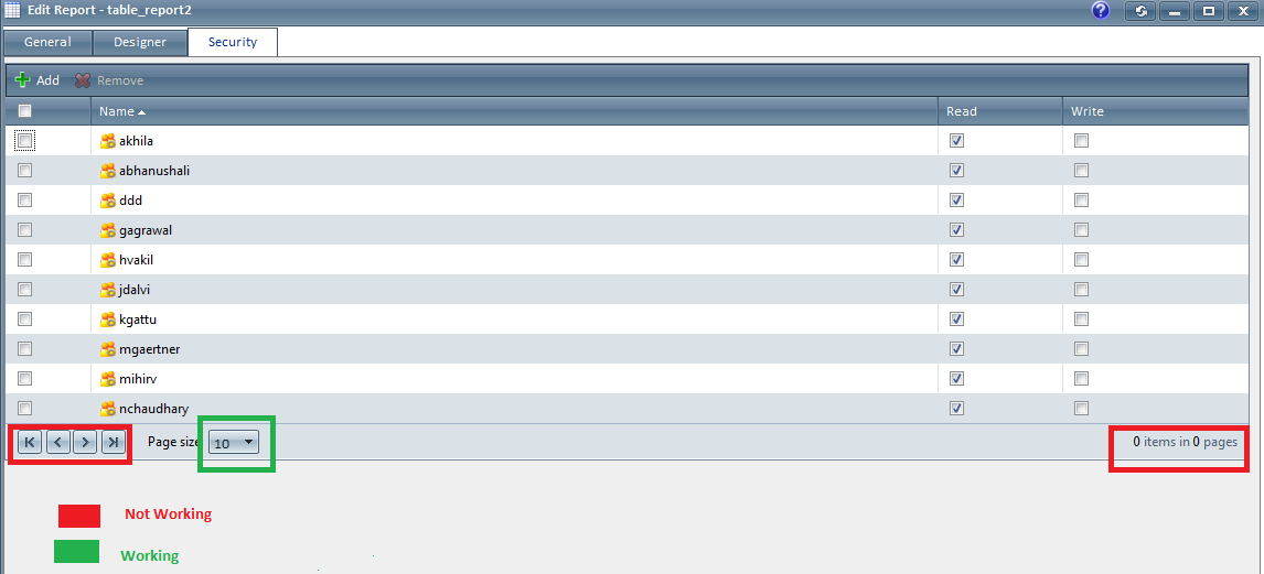 [WebMethod] public static Dictionary<string, object> wmBindSecurity(int startRowIndex, int maximumRows, List<GridSortExpression> sortExpression, List<GridFilterExpression> filterExpression) { if (HttpContext.Current.Session["UserName"] == null) throw new Exception("SESSION_TIMEOUT"); Dictionary<string, object> data = new Dictionary<string, object>(); if (HttpContext.Current.Session["AnalystFile"] == null) throw new Exception("SESSION_TIMEOUT"); List<SQCUser> allUsers = SQCUserList.GetUserList(); List<SQCUserGroup> allGroups = SQCUserGroupList.GetGroupList(); List<SQCUserGroupResourceMapping> lstUserGroupResourceMapping = ((SQWAnalystFile)HttpContext.Current.Session["AnalystFile"]).UserGroupReportMapping; List<SQCUserResourceMapping> lstUserResourceMapping = ((SQWAnalystFile)HttpContext.Current.Session["AnalystFile"]).UserReportMapping; List<SQCUser> oUsers = SQCUserList.GetUserList(); var oData = lstUserGroupResourceMapping.Select(o => new { Id = o.GroupId, Name = allGroups.Find(g => g.GroupId == o.GroupId).GroupName, Type = "User Group", AllowRead = o.AllowRead, AllowWrite = o.AllowWrite }).ToList(); oData.AddRange(lstUserResourceMapping.Select(p => new { Id = p.UserId, Name = SQCUserList.GetUserByUserID(p.UserId).UserName, Type = "User", AllowRead = p.AllowRead, AllowWrite = p.AllowWrite }).ToList()); if (oData.Count > 0) data.Add("Data", oData.Skip(startRowIndex).Take(maximumRows)); else data.Add("Data", new List<SQCUserGroupResourceMapping>()); data.Add("Count", 0); return data; }Thanks & Regards ,