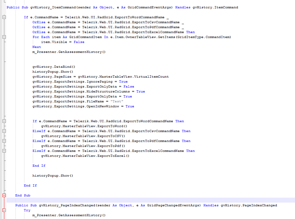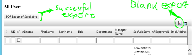 using System;using System.Collections.Generic;using System.Collections.Specialized;using System.Configuration;using System.Data;using System.IO;using System.Linq;using System.Net.Mail;using System.Text;using System.Web;using System.Web.UI;using System.Web.UI.WebControls;using SD.LLBLGen.Pro.ORMSupportClasses;using SystemAuditing.EntityClasses;using SystemAuditing.CollectionClasses;using SystemAuditing.HelperClasses;using SystemAuditing.FactoryClasses;using SystemAuditing.RelationClasses;using Telerik.Web.UI;namespace System_Audit_Review_Console{ public partial class reviewProcess : System.Web.UI.Page { protected void Page_Load(object sender, EventArgs e) { SystemUserEntity Suser = new SystemUserEntity(1); //user 1 is Admin SystemUserCollection allActiveSystemUsers = new SystemUserCollection(); //SNIP ... } protected void gridPreflightcheckUsers_ItemDataBound(object sender, GridItemEventArgs e) { if (e.Item is GridDataItem) { GridDataItem sysusr = (GridDataItem)e.Item; SystemUserEntity sysusrDetail = new SystemUserEntity(Convert.ToInt32(sysusr["SystemUserID"].Text)); sysusr["SecRoleSummary"].Text = sysusrDetail.SecRoleSummary(); } } protected void gridPreflightcheckUsers_PdfExporting(object sender, GridPdfExportingArgs e) { //to handle the automatically created in-header export button e.RawHTML = "<div style=\"font-weight:bold; font-size:1.25em;\">All System Users " + DateTime.Now.ToShortDateString() + "</div>" + e.RawHTML; } protected void alternaExportPreflightcheckUsers_Click(object sender, EventArgs e) { //for the separately created export button gridPreflightcheckUsers.ClientSettings.Scrolling.AllowScroll = false; gridPreflightcheckUsers.ClientSettings.Scrolling.UseStaticHeaders = false; gridPreflightcheckUsers.DataBind(); gridPreflightcheckUsers.MasterTableView.ExportToPdf(); } }}The automatic header export button creates an almost empty PDF: just the header shows. The "alternative" export radbutton that I put in manually exports successfully. I'd prefer to use the in-header button, though.