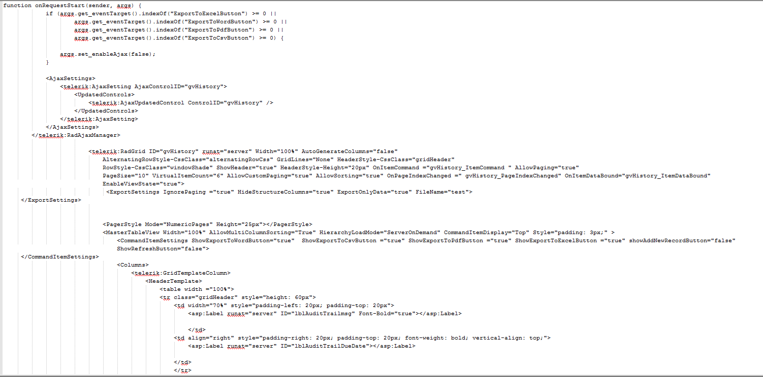 (Recommend a look at: IsActive not null and SecRoleSummary null)" AllowFilteringByColumn="True" ShowFooter="True" ShowStatusBar="True" Height="60em"19. OnItemDataBound="gridPreflightcheckUsers_ItemDataBound"20. OnPdfExporting="gridPreflightcheckUsers_PdfExporting"21. >22. <ExportSettings FileName="summary_SystemUsers" OpenInNewWindow="True" ExportOnlyData="True" Excel-Format="ExcelML" >23. <Pdf AllowCopy="True" Author="The Company" BorderStyle="Thin" PageTitle="Access Review for System" ForceTextWrap="True" PageBottomMargin="0.5in" PageLeftMargin="0.5in" PageRightMargin="0.5in" PageTopMargin="0.5in" PageHeight="8.5in" PageWidth="11in">24. </Pdf>25. <Excel Format="ExcelML" />26. </ExportSettings>27. <ClientSettings>28. <Scrolling AllowScroll="True" UseStaticHeaders="True"></Scrolling>29. </ClientSettings>30. <MasterTableView DataKeyNames="SystemUserID" DataSourceID="llblgSystemUsers" CommandItemDisplay="Top" >31. <CommandItemSettings ShowExportToPdfButton="true" ShowExportToExcelButton="false" ShowExportToCsvButton="true" ShowAddNewRecordButton="False" ShowRefreshButton="false">32. </CommandItemSettings>33. <RowIndicatorColumn Visible="False">34. </RowIndicatorColumn>35. <ExpandCollapseColumn Created="True">36. </ExpandCollapseColumn>37. <Columns>38. <telerik:GridTemplateColumn HeaderText="#" UniqueName="RowNumber" HeaderStyle-Width="3%">39. <ItemTemplate>40. <asp:Label runat="server" ID="lblRowNumberAllUsers" Width="50px" Text='<%# Container.DataSetIndex+1 %>'></asp:Label>41. </ItemTemplate>42. </telerik:GridTemplateColumn>43. <telerik:GridBoundColumn DataField="SystemUserID" DataType="System.Int32" FilterControlAltText="Filter SystemUserID column" HeaderText="UID" ReadOnly="True" SortExpression="SystemUserID" UniqueName="SystemUserID" HeaderStyle-Width="3%">44. </telerik:GridBoundColumn>45. <telerik:GridCheckBoxColumn DataField="IsActive" DataType="System.Boolean" FilterControlAltText="Filter IsActive column" HeaderText="IsActive" SortExpression="IsActive" UniqueName="IsActive" HeaderStyle-Width="3%">46. </telerik:GridCheckBoxColumn> 47. 48. <telerik:GridBoundColumn DataField="ADname" FilterControlAltText="Filter ADname column" HeaderText="ADname" SortExpression="ADname" UniqueName="ADname">49. </telerik:GridBoundColumn>50. <telerik:GridBoundColumn DataField="FirstName" FilterControlAltText="Filter FirstName column" HeaderText="FirstName" SortExpression="FirstName" UniqueName="FirstName">51. </telerik:GridBoundColumn>52. <telerik:GridBoundColumn DataField="LastName" FilterControlAltText="Filter LastName column" HeaderText="LastName" SortExpression="LastName" UniqueName="LastName">53. </telerik:GridBoundColumn>54. <telerik:GridBoundColumn DataField="ADuserDetail.Title" FilterControlAltText="Filter Title column" HeaderText="Title" SortExpression="Title" UniqueName="Title">55. </telerik:GridBoundColumn>56. <telerik:GridBoundColumn DataField="ADuserDetail.Department" FilterControlAltText="Filter Department column" HeaderText="Department" SortExpression="Department" UniqueName="Department">57. </telerik:GridBoundColumn>58. <telerik:GridBoundColumn DataField="ADuserDetail.ManagerDisplayName" FilterControlAltText="Filter Manager Name column" HeaderText="Manager Name" SortExpression="ManagerDisplayName" UniqueName="ManagerDisplayName">59. </telerik:GridBoundColumn>60. 61. <telerik:GridBoundColumn DataField="SecRoleSummary" FilterControlAltText="Filter SecRoleSummary column" HeaderText="SecRoleSummary" SortExpression="SecRoleSummary" UniqueName="SecRoleSummary" Exportable="true">62. </telerik:GridBoundColumn> 63. <telerik:GridBoundColumn DataField="AFEapprovalLimit" DataType="System.Decimal" DataFormatString="{0:C}" FilterControlAltText="Filter AFEapprovalLimit column" HeaderText="AFEapprovalLimit" SortExpression="AFEapprovalLimit" UniqueName="AFEapprovalLimit">64. </telerik:GridBoundColumn>65. <telerik:GridBoundColumn DataField="EmailAddress" FilterControlAltText="Filter EmailAddress column" HeaderText="EmailAddress" SortExpression="EmailAddress" UniqueName="EmailAddress">66. </telerik:GridBoundColumn>67. </Columns>68. </MasterTableView>69. </telerik:RadGrid>70. <llblgenpro:LLBLGenProDataSource ID="llblgSystemUsers" runat="server" DataContainerType="EntityCollection" EntityCollectionTypeName="SystemAuditing.CollectionClasses.SystemUserCollection, SystemAuditing" SortingMode="ClientSide">71. </llblgenpro:LLBLGenProDataSource>72. And the code behind:
