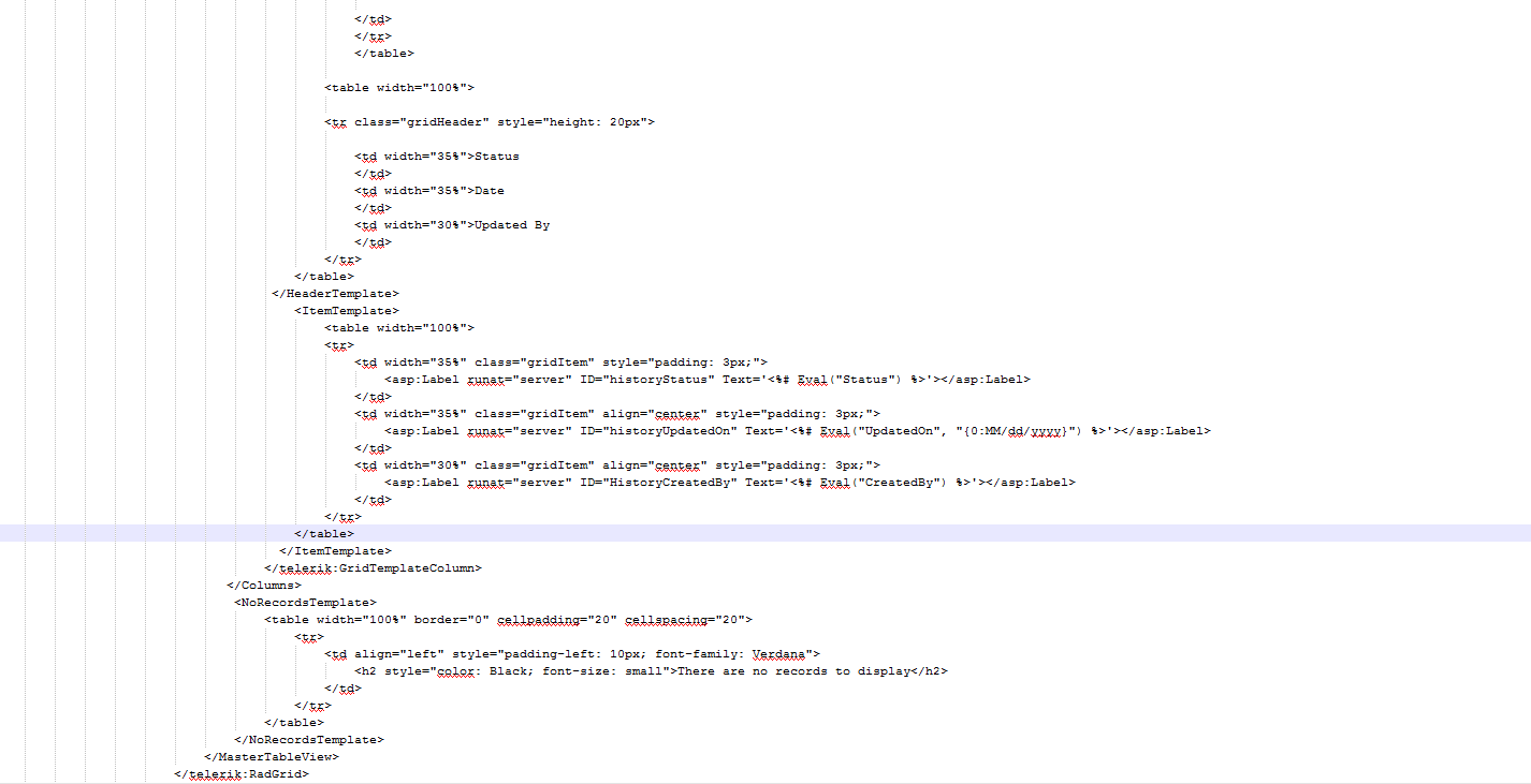 01.<%@ Page Language="C#" AutoEventWireup="true" CodeBehind="reviewProcess.aspx.cs" Inherits="ReviewClass.reviewProcess" MaintainScrollPositionOnPostback="true" %>02. 03.<%@ Register Assembly="Telerik.Web.UI" Namespace="Telerik.Web.UI" TagPrefix="telerik" %>04.<%@ Register Assembly="SD.LLBLGen.Pro.ORMSupportClasses.Web" Namespace="SD.LLBLGen.Pro.ORMSupportClasses" TagPrefix="llblgenpro" %>05. 06.<!DOCTYPE html>07. 08.<html xmlns="http://www.w3.org/1999/xhtml">09.<head runat="server">10. <title>Review Process</title>11. <link href="corporatebasic.css" rel="stylesheet" />12.</head>13.<body>14. ...15. 16. <h3>All Users</h3>17. <telerik:RadButton ID="alternaExportPreflightcheckUsers" runat="server" Text="PDF Export of Scrollable" onclick="alternaExportPreflightcheckUsers_Click"></telerik:RadButton>18. <telerik:RadGrid ID="gridPreflightcheckUsers" runat="server" AutoGenerateColumns="False" DataSourceID="llblgSystemUsers" ToolTip="System Users Overview