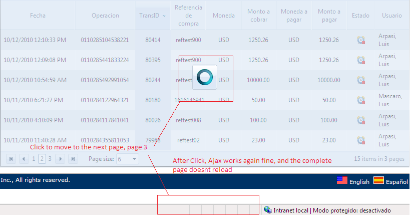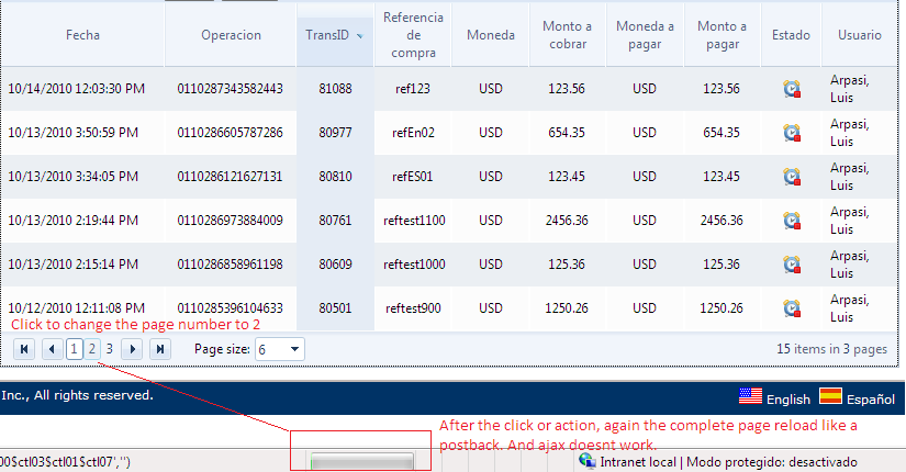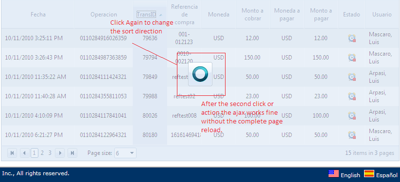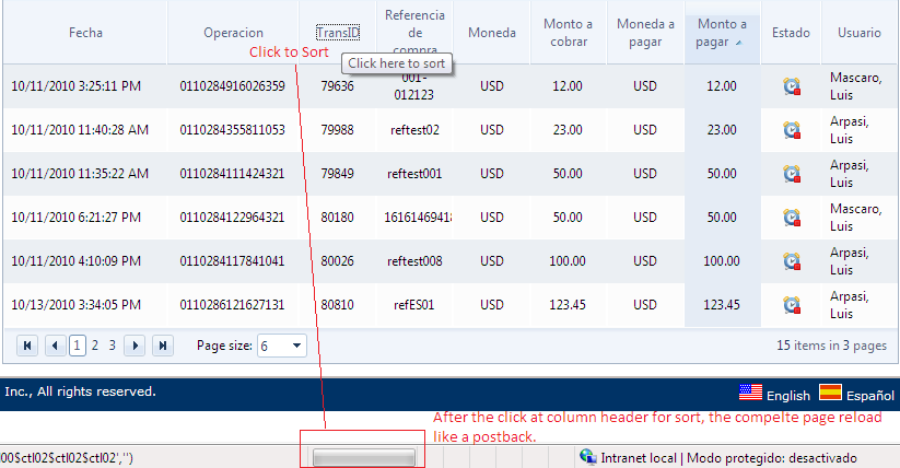 <telerik:RadGrid ID="gvwOperations" runat="server" AllowPaging="True" AutoGenerateColumns="False" GridLines="None" Skin="Windows7" AllowSorting="True" OnNeedDataSource="gvwOperations_NeedDataSource" OnItemCommand="gvwOperations_ItemCommand" onitemcreated="gvwOperations_ItemCreated" onitemdatabound="gvwOperations_ItemDataBound"> <ExportSettings ExportOnlyData="True" IgnorePaging="True" OpenInNewWindow="True"> <Pdf PageWidth="297mm" PageHeight="210mm" /> </ExportSettings> <ClientSettings EnableRowHoverStyle="true" ReorderColumnsOnClient="false" AllowKeyboardNavigation="true" > <Resizing AllowColumnResize="true" EnableRealTimeResize="true" /> </ClientSettings> <MasterTableView CommandItemDisplay="Top" TableLayout="Fixed" PageSize="6" BorderStyle="None" EnableHeaderContextMenu="true" EnableHeaderContextFilterMenu="true" IsFilterItemExpanded="false" AllowFilteringByColumn="True"> <CommandItemTemplate> <asp:CheckBox ID="chkAllowGroup" runat="server" Text="Allow Group Columns" TextAlign="Right" Checked="false" OnCheckedChanged="chkAllowGroup_CheckedChanged"/> <asp:Button ID="GridExportToCSV" runat="server" Text="CSV" OnClick="btnDownloadCSV_Click"/> <asp:Button ID="GridExportToXLS" runat="server" Text="Excel" OnClick="btnDownloadXLS_Click"/> </CommandItemTemplate> <CommandItemSettings /> <Columns> <telerik:GridBoundColumn DataField="ProcessDateTime" HeaderStyle-Width="150px" DataType="System.DateTime" HeaderText="ProcessDateTime" SortExpression="ProcessDateTime" UniqueName="ProcessDateTime" meta:resourcekey="GridBoundColumnResource1"> <HeaderStyle HorizontalAlign="Center" VerticalAlign="Middle" /> </telerik:GridBoundColumn> <telerik:GridBoundColumn DataField="OperationID" HeaderStyle-Width="120px" HeaderText="OperationID" SortExpression="OperationID" UniqueName="OperationID" meta:resourcekey="GridBoundColumnResource2"> <HeaderStyle HorizontalAlign="Center" VerticalAlign="Middle" /> <ItemStyle HorizontalAlign="Center" VerticalAlign="Middle" /> </telerik:GridBoundColumn> <telerik:GridBoundColumn DataField="TransactionID" HeaderText="TransactionID" DataType="System.Int32" SortExpression="TransactionID" UniqueName="TransactionID" meta:resourcekey="GridBoundColumnResource3"> <HeaderStyle HorizontalAlign="Center" VerticalAlign="Middle" /> <ItemStyle HorizontalAlign="Center" VerticalAlign="Middle" /> </telerik:GridBoundColumn> <telerik:GridBoundColumn DataField="MerchantSalesID" HeaderText="MerchantSalesID" SortExpression="MerchantSalesID" UniqueName="MerchantSalesID" meta:resourcekey="GridBoundColumnResource4"> <HeaderStyle HorizontalAlign="Center" VerticalAlign="Middle" /> <ItemStyle HorizontalAlign="Center" VerticalAlign="Middle" /> </telerik:GridBoundColumn> <telerik:GridBoundColumn DataField="Currency" HeaderText="Currency" SortExpression="Currency" UniqueName="Currency" meta:resourcekey="GridBoundColumnResource5"> <HeaderStyle HorizontalAlign="Center" VerticalAlign="Middle" /> <ItemStyle HorizontalAlign="Center" VerticalAlign="Middle" /> </telerik:GridBoundColumn> <telerik:GridBoundColumn DataField="Amount" DataType="System.Decimal" DataFormatString="{0:0.00}" HeaderText="Amount" SortExpression="Amount" UniqueName="Amount" meta:resourcekey="GridBoundColumnResource6"> <HeaderStyle HorizontalAlign="Center" VerticalAlign="Middle" /> <ItemStyle HorizontalAlign="Center" VerticalAlign="Middle" /> </telerik:GridBoundColumn> <telerik:GridBoundColumn DataField="ToCurrency" HeaderText="ToCurrency" SortExpression="ToCurrency" UniqueName="ToCurrency" meta:resourcekey="GridBoundColumnResource7"> <HeaderStyle HorizontalAlign="Center" VerticalAlign="Middle" /> <ItemStyle HorizontalAlign="Center" VerticalAlign="Middle" /> </telerik:GridBoundColumn> <telerik:GridBoundColumn DataField="ToAmount" DataType="System.Decimal" DataFormatString="{0:0.00}" HeaderText="ToAmount" SortExpression="ToAmount" UniqueName="ToAmount" meta:resourcekey="GridBoundColumnResource8"> <HeaderStyle HorizontalAlign="Center" VerticalAlign="Middle" /> <ItemStyle HorizontalAlign="Center" VerticalAlign="Middle" /> </telerik:GridBoundColumn> <telerik:GridTemplateColumn HeaderText="Estado" HeaderStyle-Width="55px" UniqueName="State" meta:resourcekey="GridTemplateColumnResource1"> <ItemTemplate> <asp:Image ID="imgStatus" runat="server" BorderWidth="0px" ImageUrl='<%# String.Format("~/Images/{0}.png", Eval("LastStatus")) %>' ToolTip='<%# GetLocalResourceObject(String.Format("tooltip{0}Transaction", Eval("LastStatus"))).ToString() %>' AlternateText='<%# GetLocalResourceObject(String.Format("alternateTxt{0}Transaction", Eval("LastStatus"))).ToString() %>' /> </ItemTemplate> <HeaderStyle HorizontalAlign="Center" VerticalAlign="Middle" /> <ItemStyle HorizontalAlign="Center" VerticalAlign="Middle" /> </telerik:GridTemplateColumn> <telerik:GridBoundColumn DataField="UserCompleteName" HeaderText="UserCompleteName" SortExpression="UserCompleteName" UniqueName="UserCompleteName" meta:resourcekey="GridBoundColumnResource9"> <HeaderStyle HorizontalAlign="Center" VerticalAlign="Middle" /> </telerik:GridBoundColumn> <telerik:GridBoundColumn DataField="CustomerID" HeaderText="CustomerID" Visible="false" SortExpression="CustomerID" UniqueName="CustomerID" meta:resourcekey="GridBoundColumnResource10"> </telerik:GridBoundColumn> <telerik:GridBoundColumn DataField="CustomerName" HeaderText="CustomerName" Visible="false" SortExpression="CustomerName" UniqueName="CustomerName" meta:resourcekey="GridBoundColumnResource11"> </telerik:GridBoundColumn> <telerik:GridBoundColumn DataField="CustomerEmail" HeaderText="CustomerEmail" Visible="false" SortExpression="CustomerEmail" UniqueName="CustomerEmail" meta:resourcekey="GridBoundColumnResource12"> </telerik:GridBoundColumn> </Columns> </MasterTableView> <PagerStyle Mode="NextPrevAndNumeric" /> </telerik:RadGrid>I ll attach some images so you can understand me better.
