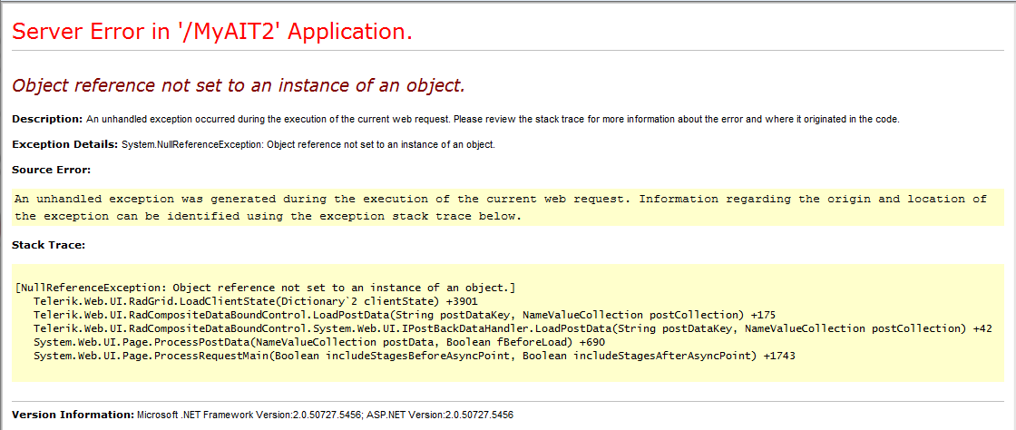 I have a toolbar that changes the grouping of the grid. If I don't do anything in the grid such as expand a group, these buttons work flawlessly. However, if I expand a group and then try to use one of the buttons, I get "Microsoft JScript runtime error: Sys.WebForms.PageRequestManagerServerErrorException: Object reference not set to an instance of an object."