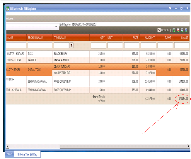 Here Gopal TODI has bought 2 items of total amt. 66778. But while calculating the summary of B.AMT ,66778 is added twice.