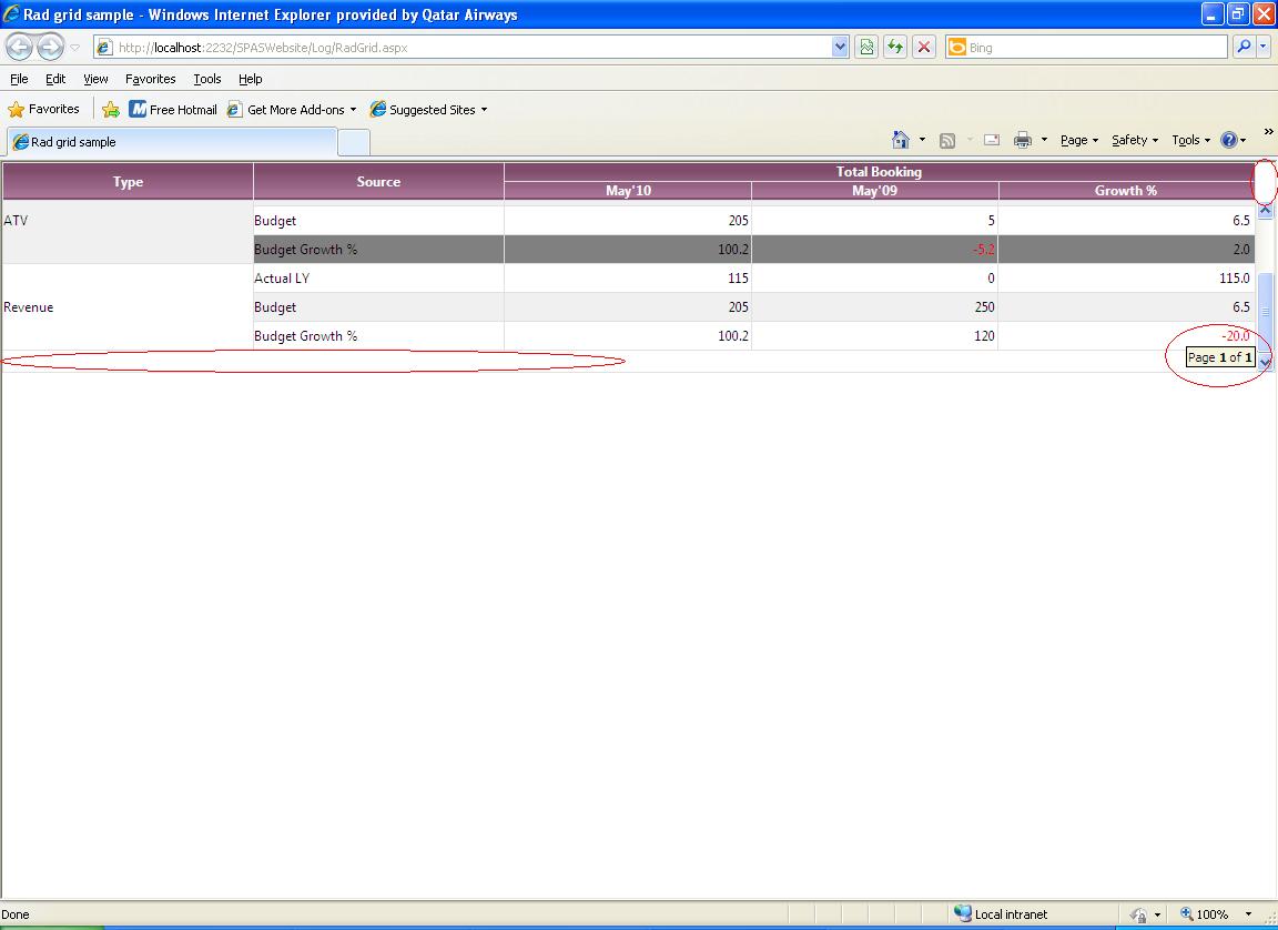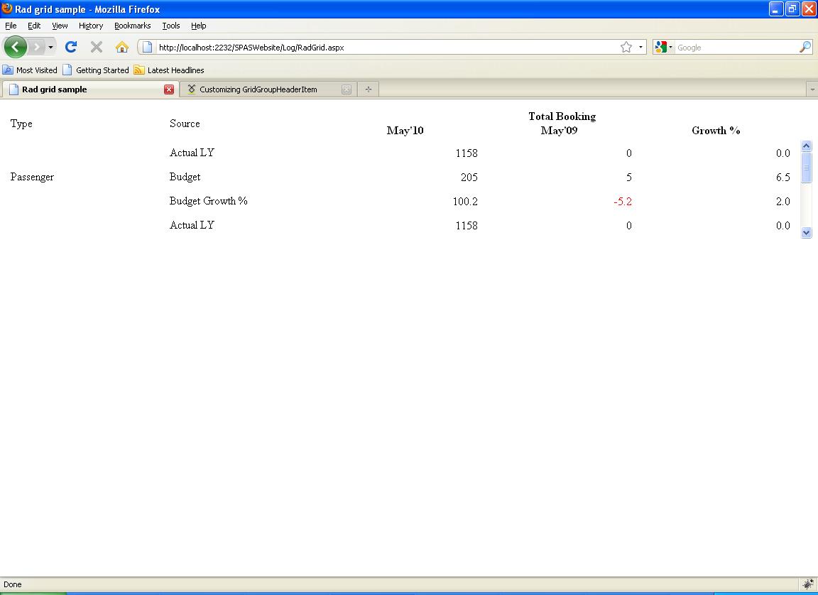 <%@ Page Language="C#" AutoEventWireup="true" CodeFile="RadGrid.aspx.cs" Inherits="Log_RadGrid" %> <%@ Register Assembly="Telerik.Web.UI" Namespace="Telerik.Web.UI" TagPrefix="telerik" %> <!DOCTYPE html PUBLIC "-//W3C//DTD XHTML 1.0 Transitional//EN" "http://www.w3.org/TR/xhtml1/DTD/xhtml1-transitional.dtd"> <html xmlns="http://www.w3.org/1999/xhtml"> <head runat="server"> <title>Rad grid sample</title> <link rel="stylesheet" type="text/css" href="..\style\Stylesheet.css" /> <link rel="stylesheet" type="text/css" href="..\style\SpasGrid.css" /> <style type="text/css"> .class1 { cursor: pointer; } </style> </head> <body> <form id="form1" runat="server"> <asp:ScriptManager ID="ScriptManager1" runat="server"> </asp:ScriptManager> <div style="width: 100%"> <telerik:RadGrid ID="gridSumm" runat="server" AutoGenerateColumns="false" CssClass="MyCustomScrollImage" Height="188px" OnPreRender="gridSumm_PreRender" Skin="SpasSkin" SkinID="SpasGrid" EnableEmbeddedSkins="false" AllowPaging="false" PageSize="6" OnItemDataBound="gridSumm_ItemDataBound" OnSelectedIndexChanged="gridSumm_SelectedIndexChanged"> <MasterTableView DataKeyNames="Type" Width="100%"> <RowIndicatorColumn UniqueName="RowIndicator"> </RowIndicatorColumn> <EditFormSettings> <EditColumn UniqueName="EditCommandColumn1"> </EditColumn> </EditFormSettings> <Columns> <telerik:GridBoundColumn HeaderText="Type" DataField="Type" UniqueName="Type" ItemStyle-Width="20%"> </telerik:GridBoundColumn> <telerik:GridBoundColumn HeaderText="Source" DataField="Source" UniqueName="Source" ItemStyle-Width="20%"> </telerik:GridBoundColumn> <telerik:GridTemplateColumn UniqueName="GroupColumn1" ItemStyle-Width="60%"> <HeaderTemplate> <table id="tblTotalBooking" width="100%" cellpadding="0" cellspacing="0"> <tr> <td width="100%" colspan="3" align="center" class="gridMergeColHeader"> <b>Total Booking</b> </td> </tr> <tr> <td style="width: 33%;" align="center" class="gridSubColHeader"> <b>May'10</b> </td> <td style="width: 33%;" align="center" class="gridSubColHeader"> <b>May'09</b> </td> <td style="border-right: none;" align="center"> <b>Growth %</b> </td> </tr> </table> </HeaderTemplate> <ItemTemplate> <table id="tblTotalBookingValue" width="100%" cellpadding="0" cellspacing="0"> <tr> <td class="gridSubCol" style="width: 33%; text-align: right;"> <asp:Label ID="lblMay10" runat="server" Text='<%# DataBinder.Eval(Container.DataItem, "May10") %>'></asp:Label> </td> <td class="gridSubCol" style="width: 33%; text-align: right;"> <asp:Label ID="lblMay09" runat="server" Text='<%# DataBinder.Eval(Container.DataItem, "May09") %>'></asp:Label> </td> <td class="gridSubCol" style="border-right: none !important; text-align: right;"> <asp:Label ID="lblGrowth" runat="server" Text='<%# DataBinder.Eval(Container.DataItem, "Growth") %>'></asp:Label> </td> </tr> </table> </ItemTemplate> </telerik:GridTemplateColumn> </Columns> </MasterTableView> <PagerStyle Mode="NumericPages" PagerTextFormat="{0}" CssClass="rgPager" /> <ClientSettings> <Scrolling AllowScroll="True" EnableVirtualScrollPaging="True" UseStaticHeaders="true" SaveScrollPosition="True"></Scrolling> <Selecting AllowRowSelect="True"></Selecting> </ClientSettings> </telerik:RadGrid> </div> </form> </body> </html> C# Code: (RadGrid.aspx.cs)