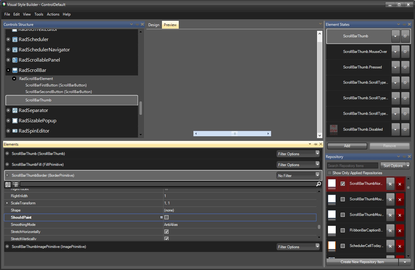 I have created a custom theme for our application. I have themed the RadGridView and the RadScrollbars. The issue I have is the scrollbars on the grid.do not respect the theme that was created for the scrollbars. The scrollbar theme does not have dark borders around all of the objects, they are light gray. Yet the grid does not have the light borders. Is these something I am missing?