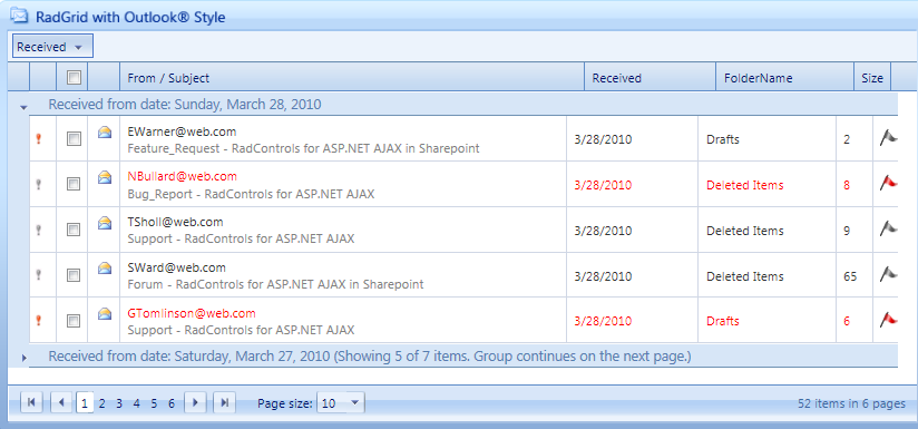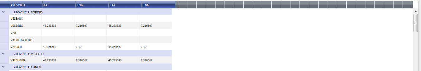 <telerik:RadGrid ID="RadGrid1" OnNeedDataSource="RadGrid1_NeedDataSource" AutoGenerateColumns="false" runat="server"> <ClientSettings> <Scrolling AllowScroll="true" ScrollHeight="500" UseStaticHeaders="true" /> </ClientSettings> <MasterTableView TableLayout="Fixed" runat="server"> <GroupByExpressions> <telerik:GridGroupByExpression> <GroupByFields> <telerik:GridGroupByField FieldName="IdProvincia" /> </GroupByFields> <SelectFields> <telerik:GridGroupByField FieldName="Provincia" /> </SelectFields> </telerik:GridGroupByExpression> </GroupByExpressions> <Columns> <telerik:GridBoundColumn DataField="Airport" HeaderText="Provincia" ItemStyle-Width="100px" HeaderStyle-Width="100px"></telerik:GridBoundColumn> <telerik:GridBoundColumn DataField="LAT" HeaderText="LAT" ItemStyle-Width="100px" HeaderStyle-Width="100px"></telerik:GridBoundColumn> <telerik:GridBoundColumn DataField="LNG" HeaderText="LNG" ItemStyle-Width="100px" HeaderStyle-Width="100px"></telerik:GridBoundColumn> <telerik:GridBoundColumn DataField="LAT" HeaderText="LAT" ItemStyle-Width="100px" HeaderStyle-Width="100px"></telerik:GridBoundColumn> <telerik:GridBoundColumn DataField="LNG" HeaderText="LNG" ItemStyle-Width="100px" HeaderStyle-Width="100px"></telerik:GridBoundColumn> </Columns> </MasterTableView></telerik:RadGrid>