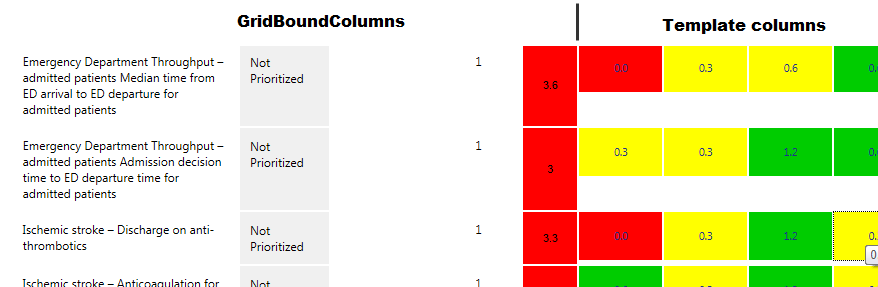 The template column is composed of an ASP link button that contains a table with 1 cell; a score with color. The problem arises that some of the GridBoundColumn cells have lots of text, others with little to no text. The template column cells are not expanding to fill the row height in IE. GridboundColumn cells are behaving as they should. I'm at a complete loss here. Everything checks out style wise.