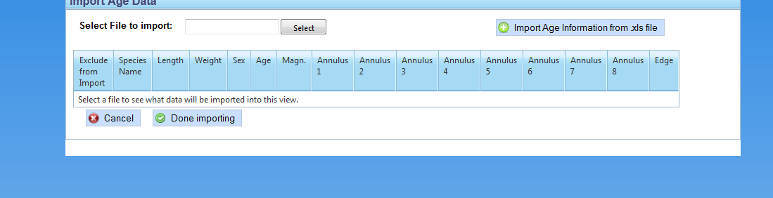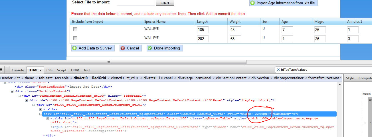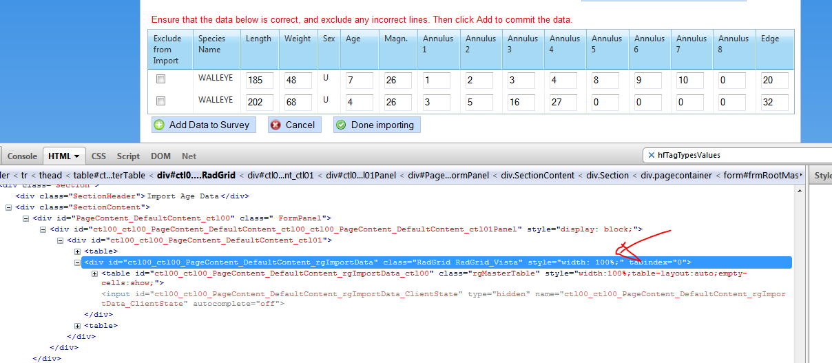<tel:RadGrid runat="server" ID="rgImportData" AutoGenerateColumns="false" Width="100%" > <MasterTableView> <Columns> <tel:GridTemplateColumn HeaderText="Exclude from Import" UniqueName="ExcludeColumn" > <ItemTemplate> <asp:CheckBox ID="cbExcludeFromImport" runat="server" /> </ItemTemplate> </tel:GridTemplateColumn> <tel:GridBoundColumn DataField="SpeciesName" HeaderText="Species Name" UniqueName="SpeciesName" /> <tel:GridBoundColumn DataField="SpeciesID" UniqueName="SpeciesID" Display="false" /> <tel:GridTemplateColumn HeaderText="Length" UniqueName="Length" > <ItemTemplate> <tel:RadNumericTextBox runat="server" ID="rgrntLength" Text='<%# Eval("Length") %>' NumberFormat-DecimalDigits="0" Width="40px" MaxValue="9999" /> </ItemTemplate> </tel:GridTemplateColumn> <tel:GridTemplateColumn HeaderText="Weight" UniqueName="Weight" > <ItemTemplate> <tel:RadNumericTextBox runat="server" ID="rgrntWeight" Text='<%# Eval("Weight") %>' NumberFormat-DecimalDigits="0" Width="40px" MaxValue="9999" /> </ItemTemplate> </tel:GridTemplateColumn> <tel:GridBoundColumn DataField="Sex" HeaderText="Sex" UniqueName="Sex" /> <tel:GridTemplateColumn HeaderText="Age" UniqueName="Age" > <ItemTemplate> <tel:RadNumericTextBox runat="server" ID="rgrntAge" Text='<%# Eval("Age") %>' NumberFormat-DecimalDigits="0" Width="40px" MaxValue="9999" /> </ItemTemplate> </tel:GridTemplateColumn> <tel:GridTemplateColumn HeaderText="Magn." UniqueName="Magnification" > <ItemTemplate> <tel:RadNumericTextBox runat="server" ID="rgrntMagnification" Text='<%# Eval("Magnification") %>' NumberFormat-DecimalDigits="0" Width="40px" MaxValue="9999" /> </ItemTemplate> </tel:GridTemplateColumn> <tel:GridTemplateColumn HeaderText="Annulus 1" UniqueName="Annulus1" > <ItemTemplate> <tel:RadNumericTextBox runat="server" ID="rgrntAnn1" Text='<%# Eval("Annulus1") %>' NumberFormat-DecimalDigits="0" Width="40px" MaxValue="9999" /> </ItemTemplate> </tel:GridTemplateColumn> <tel:GridTemplateColumn HeaderText="Annulus 2" UniqueName="Annulus2" > <ItemTemplate> <tel:RadNumericTextBox runat="server" ID="rgrntAnn2" Text='<%# Eval("Annulus2") %>' NumberFormat-DecimalDigits="0" Width="40px" MaxValue="9999" /> </ItemTemplate> </tel:GridTemplateColumn> <tel:GridTemplateColumn HeaderText="Annulus 3" UniqueName="Annulus3" > <ItemTemplate> <tel:RadNumericTextBox runat="server" ID="rgrntAnn3" Text='<%# Eval("Annulus3") %>' NumberFormat-DecimalDigits="0" Width="40px" MaxValue="9999" /> </ItemTemplate> </tel:GridTemplateColumn> <tel:GridTemplateColumn HeaderText="Annulus 4" UniqueName="Annulus4" > <ItemTemplate> <tel:RadNumericTextBox runat="server" ID="rgrntAnn4" Text='<%# Eval("Annulus4") %>' NumberFormat-DecimalDigits="0" Width="40px" MaxValue="9999" /> </ItemTemplate> </tel:GridTemplateColumn> <tel:GridTemplateColumn HeaderText="Annulus 5" UniqueName="Annulus5" > <ItemTemplate> <tel:RadNumericTextBox runat="server" ID="rgrntAnn5" Text='<%# Eval("Annulus5") %>' NumberFormat-DecimalDigits="0" Width="40px" MaxValue="9999" /> </ItemTemplate> </tel:GridTemplateColumn> <tel:GridTemplateColumn HeaderText="Annulus 6" UniqueName="Annulus6" > <ItemTemplate> <tel:RadNumericTextBox runat="server" ID="rgrntAnn6" Text='<%# Eval("Annulus6") %>' NumberFormat-DecimalDigits="0" Width="40px" MaxValue="9999" /> </ItemTemplate> </tel:GridTemplateColumn> <tel:GridTemplateColumn HeaderText="Annulus 7" UniqueName="Annulus7" > <ItemTemplate> <tel:RadNumericTextBox runat="server" ID="rgrntAnn7" Text='<%# Eval("Annulus7") %>' NumberFormat-DecimalDigits="0" Width="40px" MaxValue="9999" /> </ItemTemplate> </tel:GridTemplateColumn> <tel:GridTemplateColumn HeaderText="Annulus 8" UniqueName="Annulus8" > <ItemTemplate> <tel:RadNumericTextBox runat="server" ID="rgrntAnn8" Text='<%# Eval("Annulus8") %>' NumberFormat-DecimalDigits="0" Width="40px" MaxValue="9999" /> </ItemTemplate> </tel:GridTemplateColumn> <tel:GridTemplateColumn HeaderText="Edge" UniqueName="Edge" > <ItemTemplate> <tel:RadNumericTextBox runat="server" ID="rgrntEdge" Text='<%# Eval("Edge") %>' NumberFormat-DecimalDigits="0" Width="40px" MaxValue="9999" /> </ItemTemplate> </tel:GridTemplateColumn> </Columns> <NoRecordsTemplate> Select a file to see what data will be imported into this view. </NoRecordsTemplate> </MasterTableView></tel:RadGrid>