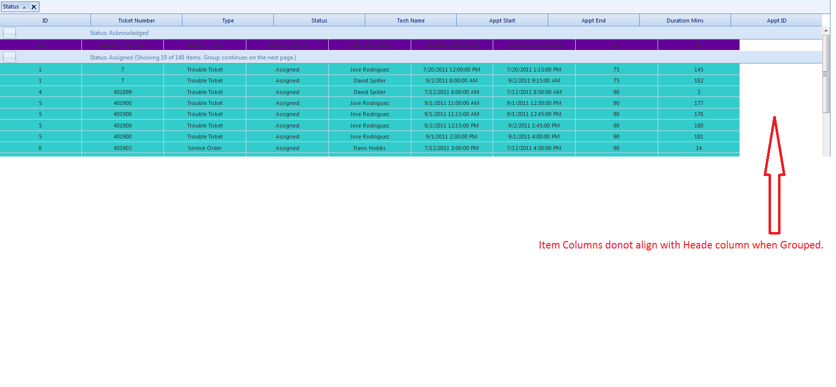 <telerik:RadGrid ID="TicketsGrid" runat="server" EnableEmbeddedSkins="false" AllowPaging="True" PageSize="20" AllowFilteringByColumn="True" AllowSorting="True" ShowGroupPanel="True" ClientSettings-ClientEvents-OnRowClick="gridClick" EnableHeaderContextFilterMenu="True" EnableHeaderContextMenu="True" GridLines="None" oncolumncreated="rgTicketsGrid_ColumnCreated" ondatabound="rgTicketsGrid_DataBound" ongroupschanging="rgTicketsGrid_GroupsChanging" onsortcommand="rgTicketsGrid_SortCommand" onpageindexchanged="rgTicketsGrid_PageIndexChanged" onpagesizechanged="rgTicketsGrid_PageSizeChanged" > <mastertableview allowfilteringbycolumn="False" GroupLoadMode="Server" Height="95%" TableLayout="Auto" > </mastertableview> <SortingSettings EnableSkinSortStyles="false" /> <clientsettings allowdragtogroup="True" allowrowsdragdrop="True" enablerowhoverstyle="True" > <selecting allowrowselect="True" /> <clientevents onrowdropping="rowDropping" /> <clientevents onrowcontextmenu="RowContextMenu" /> <Scrolling AllowScroll="True" UseStaticHeaders="True" SaveScrollPosition="true" > </Scrolling> </clientsettings> <activeitemstyle borderstyle="Solid" font-bold="True" /> <PagerStyle Mode="NextPrevAndNumeric"></PagerStyle> <GroupingSettings ShowUnGroupButton="true" /> <HeaderStyle HorizontalAlign="Center" VerticalAlign="Middle" /> <ItemStyle HorizontalAlign="Left" VerticalAlign="Middle" /> <AlternatingItemStyle HorizontalAlign="Left" VerticalAlign="Middle" /> </telerik:RadGrid>If I use Fixed Table layout, all columns headers render properly and Fixed layout shows problem when you try to group records by field name. When grouped in fixed layout, edge of column headers and items do not align. In grouped mode, all records squeeze to left.