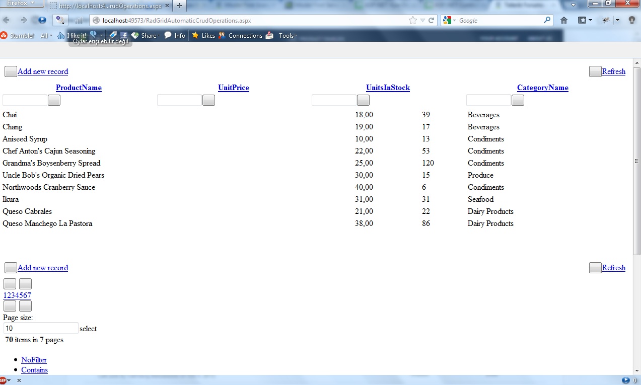 <%@ Page Language="C#" AutoEventWireup="true" CodeBehind="RadGridAutomaticCrudOperations.aspx.cs" Inherits="RadGridAutomaticCrudOperations" %><!DOCTYPE html PUBLIC "-//W3C//DTD XHTML 1.0 Transitional//EN" "http://www.w3.org/TR/xhtml1/DTD/xhtml1-transitional.dtd"><html xmlns="http://www.w3.org/1999/xhtml"><head runat="server"> <title></title> <style type="text/css"> .MyImageButton { cursor: hand; } .EditFormHeader td { font-size: 14px; padding: 4px !important; color: #0066cc; } </style> <telerik:RadStyleSheetManager ID="RadStyleSheetManager1" runat="server" CdnSettings-TelerikCdn="Enabled" /></head><body> <form id="form1" runat="server"> <telerik:RadAjaxManager runat="server" DefaultLoadingPanelID="RadAjaxLoadingPanel1" EnableHistory="True"> </telerik:RadAjaxManager> <telerik:RadScriptManager ID="RadScriptManager1" runat="server" CdnSettings-TelerikCdn="Enabled"> <scripts> <%--Needed for JavaScript IntelliSense in VS2010--%> <%--For VS2008 replace RadScriptManager with ScriptManager--%> <asp:ScriptReference Assembly="Telerik.Web.UI" Name="Telerik.Web.UI.Common.Core.js" /> <asp:ScriptReference Assembly="Telerik.Web.UI" Name="Telerik.Web.UI.Common.jQuery.js" /> <asp:ScriptReference Assembly="Telerik.Web.UI" Name="Telerik.Web.UI.Common.jQueryInclude.js" /> </scripts> </telerik:RadScriptManager> <telerik:RadAjaxLoadingPanel ID="RadAjaxLoadingPanel1" runat="server" /> <telerik:RadAjaxPanel ID="RadAjaxPanel1" runat="server"> <telerik:RadGrid ID="RadGrid1" GridLines="None" runat="server" AllowAutomaticDeletes="True" AllowSorting="True" AllowAutomaticInserts="True" AllowAutomaticUpdates="True" AllowMultiRowEdit="True" AllowPaging="True" DataSourceID="DataSource1" OnItemUpdated="RadGrid1_ItemUpdated" AllowFilteringByColumn="True" OnItemDeleted="RadGrid1_ItemDeleted" OnItemInserted="RadGrid1_ItemInserted" OnDataBound="RadGrid1_DataBound" CellSpacing="0"> <pagerstyle mode="NextPrevAndNumeric" /> <ClientSettings> <Scrolling AllowScroll="True" UseStaticHeaders="True" /> </ClientSettings> <mastertableview autogeneratecolumns="False" commanditemdisplay="TopAndBottom" datakeynames="ProductID" datasourceid="DataSource1" editmode="EditForms" horizontalalign="NotSet" width="100%"> <commanditemsettings exporttopdftext="Export to PDF" /> <rowindicatorcolumn filtercontrolalttext="Filter RowIndicator column" visible="True"> </rowindicatorcolumn> <expandcollapsecolumn filtercontrolalttext="Filter ExpandColumn column" visible="True"> </expandcollapsecolumn> <Columns> <telerik:GridBoundColumn DataField="ProductID" DataType="System.Int32" Display="False" FilterControlAltText="Filter ProductID column" HeaderText="ProductID" ReadOnly="True" SortExpression="ProductID" UniqueName="ProductID"> </telerik:GridBoundColumn> <telerik:GridBoundColumn DataField="ProductName" FilterControlAltText="Filter ProductName column" HeaderText="ProductName" SortExpression="ProductName" UniqueName="ProductName"> </telerik:GridBoundColumn> <telerik:GridBoundColumn DataField="SupplierID" DataType="System.Int32" Display="False" FilterControlAltText="Filter SupplierID column" HeaderText="SupplierID" SortExpression="SupplierID" UniqueName="SupplierID"> </telerik:GridBoundColumn> <telerik:GridBoundColumn DataField="CategoryID" DataType="System.Int32" Display="False" FilterControlAltText="Filter CategoryID column" HeaderText="CategoryID" SortExpression="CategoryID" UniqueName="CategoryID"> </telerik:GridBoundColumn> <telerik:GridBoundColumn DataField="QuantityPerUnit" Display="False" FilterControlAltText="Filter QuantityPerUnit column" HeaderText="QuantityPerUnit" SortExpression="QuantityPerUnit" UniqueName="QuantityPerUnit"> </telerik:GridBoundColumn> <telerik:GridBoundColumn DataField="UnitPrice" DataType="System.Decimal" FilterControlAltText="Filter UnitPrice column" HeaderText="UnitPrice" SortExpression="UnitPrice" UniqueName="UnitPrice"> </telerik:GridBoundColumn> <telerik:GridBoundColumn DataField="UnitsInStock" DataType="System.Int16" FilterControlAltText="Filter UnitsInStock column" HeaderText="UnitsInStock" SortExpression="UnitsInStock" UniqueName="UnitsInStock"> </telerik:GridBoundColumn> <telerik:GridBoundColumn DataField="UnitsOnOrder" DataType="System.Int16" Display="False" FilterControlAltText="Filter UnitsOnOrder column" HeaderText="UnitsOnOrder" SortExpression="UnitsOnOrder" UniqueName="UnitsOnOrder"> </telerik:GridBoundColumn> <telerik:GridBoundColumn DataField="ReorderLevel" DataType="System.Int16" Display="False" FilterControlAltText="Filter ReorderLevel column" HeaderText="ReorderLevel" SortExpression="ReorderLevel" UniqueName="ReorderLevel"> </telerik:GridBoundColumn> <telerik:GridCheckBoxColumn DataField="Discontinued" DataType="System.Boolean" Display="False" FilterControlAltText="Filter Discontinued column" HeaderText="Discontinued" SortExpression="Discontinued" UniqueName="Discontinued"> </telerik:GridCheckBoxColumn> <telerik:GridBoundColumn DataField="CategoryName" FilterControlAltText="Filter CategoryName column" HeaderText="CategoryName" SortExpression="CategoryName" UniqueName="CategoryName"> </telerik:GridBoundColumn> </Columns> <editformsettings> <formtableitemstyle wrap="False" /> <formtablestyle backcolor="White" cellpadding="2" cellspacing="0" height="110px" /> <formmaintablestyle backcolor="White" cellpadding="3" cellspacing="0" width="100%" /> <formcaptionstyle cssclass="EditFormHeader" /> <FormMainTableStyle BackColor="White" CellPadding="3" CellSpacing="0" GridLines="None" Width="100%" /> <FormTableStyle BackColor="White" CellPadding="2" CellSpacing="0" Height="110px" /> <formtablealternatingitemstyle wrap="False" /> <editcolumn buttontype="ImageButton" canceltext="Cancel edit" uniquename="EditCommandColumn1"> </editcolumn> <formtablebuttonrowstyle cssclass="EditFormButtonRow" horizontalalign="Right" /> </editformsettings> </mastertableview> <filtermenu enableimagesprites="False"> </filtermenu> </telerik:RadGrid> <telerik:RadWindowManager ID="RadWindowManager1" runat="server"> </telerik:RadWindowManager> </