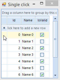 public partial class Form2 : Form{ public Form2() { InitializeComponent(); var dataTable = new DataTable(); dataTable.Columns.Add("Id", typeof(int)); dataTable.Columns.Add("Name", typeof(string)); dataTable.Columns.Add("IsValid", typeof(bool)); for (int i = 0; i < 10; i++) { dataTable.Rows.Add(i, "Name " + i, i % 2 == 0 ? true : false); } this.radGridView1.DataSource = dataTable; this.radGridView1.CurrentRow = null; } private void radGridView1_RowFormatting(object sender, Telerik.WinControls.UI.RowFormattingEventArgs e) { if (e.RowElement.RowInfo.Tag == "format") { e.RowElement.DrawFill = true; e.RowElement.GradientStyle = GradientStyles.Solid; e.RowElement.BackColor = Color.Aqua; } else { e.RowElement.ResetValue(LightVisualElement.BackColorProperty, ValueResetFlags.Local); e.RowElement.ResetValue(LightVisualElement.GradientStyleProperty, ValueResetFlags.Local); e.RowElement.ResetValue(LightVisualElement.DrawFillProperty, ValueResetFlags.Local); } } private void radGridView1_CellDoubleClick(object sender, GridViewCellEventArgs e) { int rowIndex = e.RowIndex; var editor = e.ActiveEditor; if (editor is GridViewRowHeaderColumn) { GridViewRowInfo clickedRow = this.radGridView1.Rows[e.RowIndex]; var rowEl = this.radGridView1.GridViewElement.CurrentRow; GridViewRowInfo currentRow = this.radGridView1.CurrentRow; } } GridViewRowInfo oldRowInfo; GridViewRowInfo currentRowInfo; private void radGridView1_MouseDoubleClick(object sender, MouseEventArgs e) { var location = e.Location; GridCellElement cell = this.radGridView1.ElementTree.GetElementAtPoint(e.Location) as GridCellElement; if(cell == null && this.radGridView1.IsInEditMode) { cell = this.radGridView1.ElementTree.GetElementAtPoint(e.Location).Parent as GridCellElement; } if (cell != null) { this.SetFormatTag(); } } private void radGridView1_CellEditorInitialized(object sender, GridViewCellEventArgs e) { RadTextBoxEditor editor = e.ActiveEditor as RadTextBoxEditor; if (editor!=null) { RadTextBoxEditorElement tbElement = editor.EditorElement as RadTextBoxEditorElement; tbElement.TextBoxItem.HostedControl.DoubleClick -= EditorElement_DoubleClick; tbElement.TextBoxItem.HostedControl.DoubleClick += EditorElement_DoubleClick; tbElement.TextBoxItem.HostedControl.Click -= EditorElement_Click; tbElement.TextBoxItem.HostedControl.Click += EditorElement_Click; } } private void EditorElement_Click(object sender, EventArgs e) { this.SetFormatTag(); } private void EditorElement_DoubleClick(object sender, EventArgs e) { this.SetFormatTag(); } private void SetFormatTag() { oldRowInfo = currentRowInfo; currentRowInfo = this.radGridView1.CurrentRow; currentRowInfo.Tag = "format"; if (oldRowInfo != null) { oldRowInfo.Tag = null; } }}I am also sending you two .gif files showing you how the grid looks using either approach.