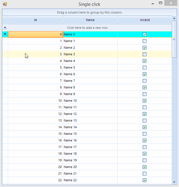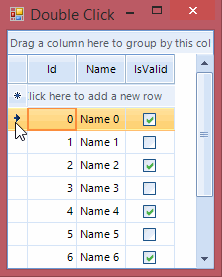 public partial class Form1 : Form{ public Form1() { InitializeComponent(); var dataTable = new DataTable(); dataTable.Columns.Add("Id", typeof(int)); dataTable.Columns.Add("Name", typeof(string)); dataTable.Columns.Add("IsValid", typeof(bool)); for (int i = 0; i < 10; i++) { dataTable.Rows.Add(i, "Name " + i, i % 2 == 0 ? true : false); } this.radGridView1.DataSource = dataTable; this.radGridView1.CurrentRow = null; this.radGridView1.RowFormatting += radGridView1_RowFormatting; } private void radGridView1_RowFormatting(object sender, Telerik.WinControls.UI.RowFormattingEventArgs e) { if (e.RowElement.IsSelected) { e.RowElement.DrawFill = true; e.RowElement.GradientStyle = GradientStyles.Solid; e.RowElement.BackColor = Color.Aqua; } else { e.RowElement.ResetValue(LightVisualElement.BackColorProperty, ValueResetFlags.Local); e.RowElement.ResetValue(LightVisualElement.GradientStyleProperty, ValueResetFlags.Local); e.RowElement.ResetValue(LightVisualElement.DrawFillProperty, ValueResetFlags.Local); } }}Changing the color of a selected row on а double click is a little bit more tricky. Apart from subscribing to RowFormatting event you would also need to handle CellDoubleClick, MouseDoubleClick, CellEditorInitialized, EditorElement_Click and EditorElement_DoubleClick events. The reason is that the editor becomes active when you click on a cell and there you should write your own logic to fire up the events. I have prepared sample implementation as well: