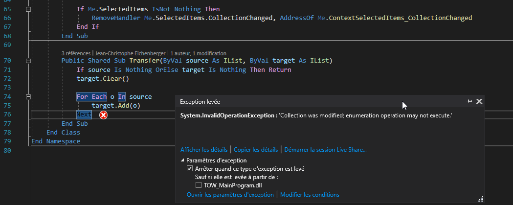 It's fire the event OnSelectedItemsPropertyChanged change and so the sub Transfer is called but as the collection changed the Transfer sub crach.