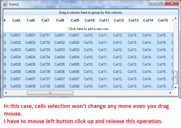 As noted in my previous post, we have a known issue when selecting multiple cells with mouse drag and the vertical/horizontal scrollbar are moved. These cells that are outside the current view get unselected. There is suggested a workaround in the referred feedback item. This issue is addressed in the latest version.