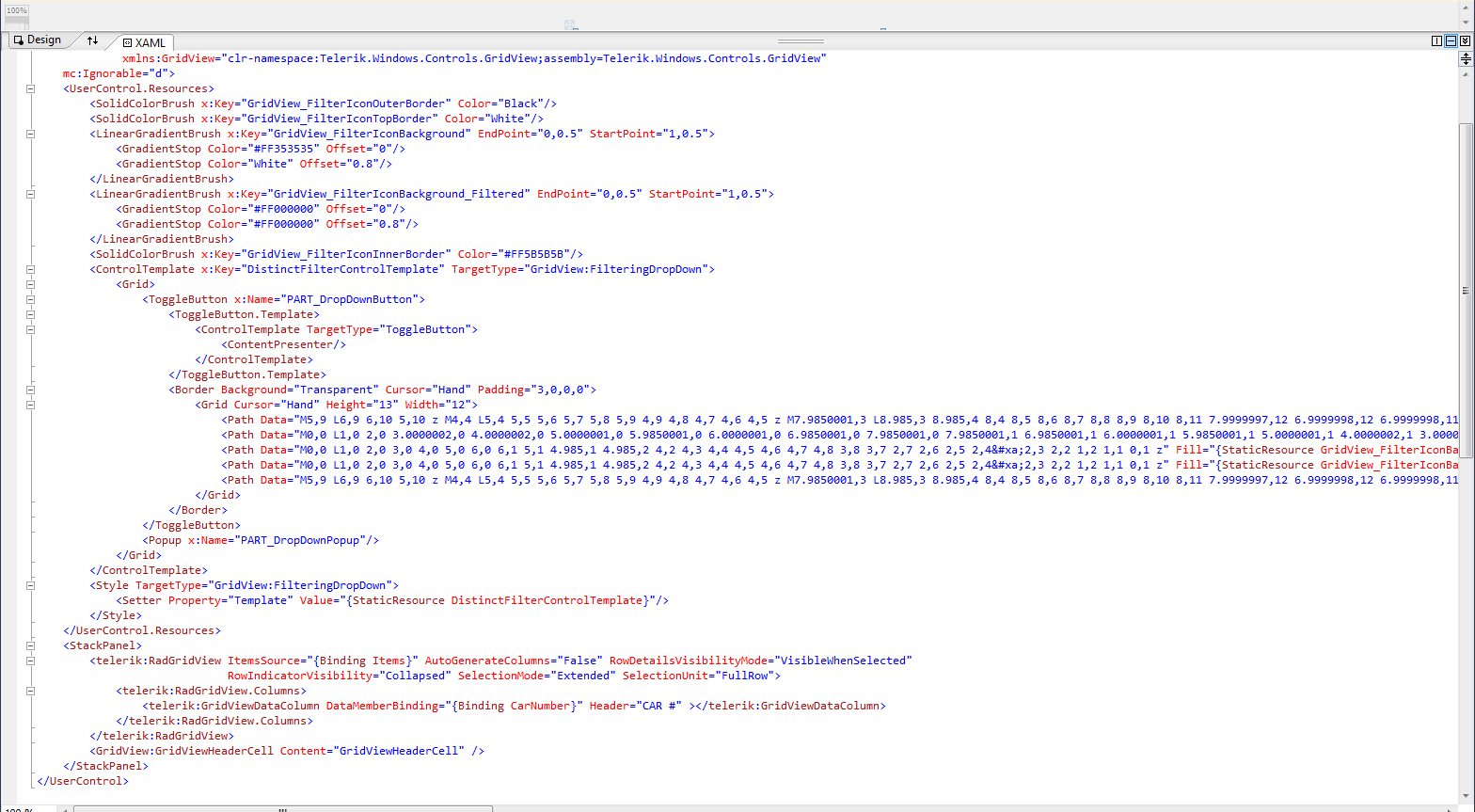 I am applying a template and styles to a telerik RadGridView to adjust the colour of the filter icon when it is selected.