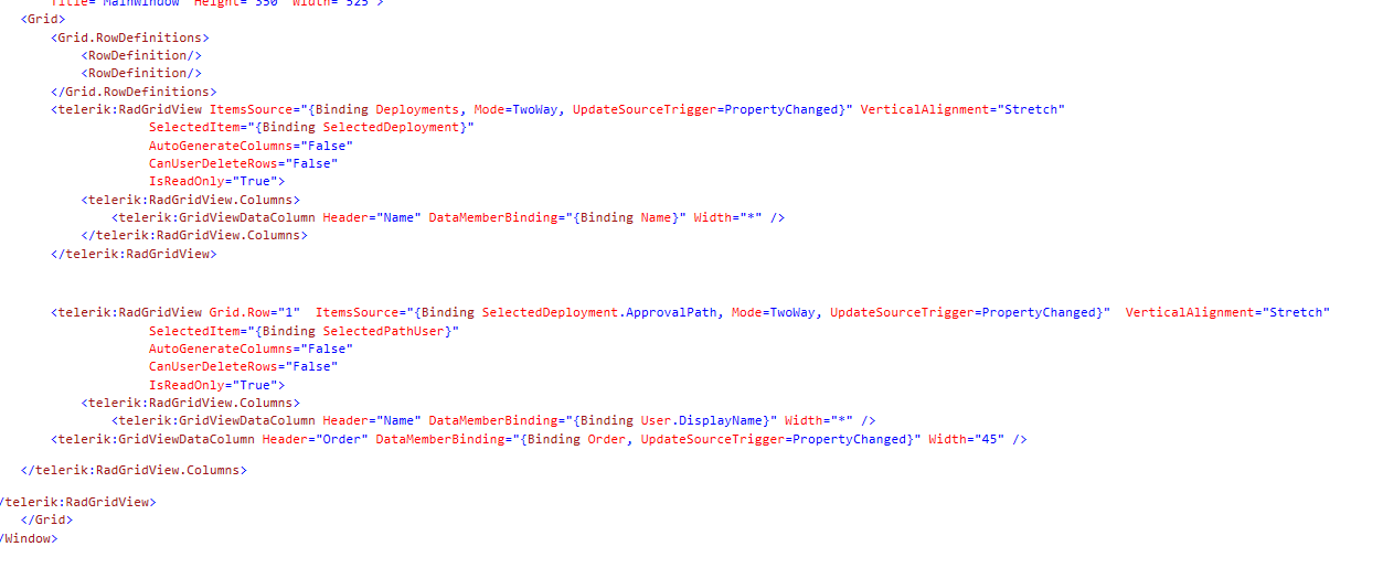 Then I have the next RadGridView that binds to the SelectedDeployment.ApprovalPath so I can display the approval path of the specific deployment (list of users with a specific order). The SelectedItem of this specific ApprovalPath (DeploymentApprovalPath type) is bound to the SelectedPathUser property.