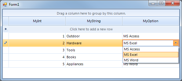 In comboboxes I would like to have options like: "MS Access", "MS Excel", and a few more. These are options user can choose, and these options are not in DataTable from beginning. How can I populate binded ComboBox with different values than from DataTable?